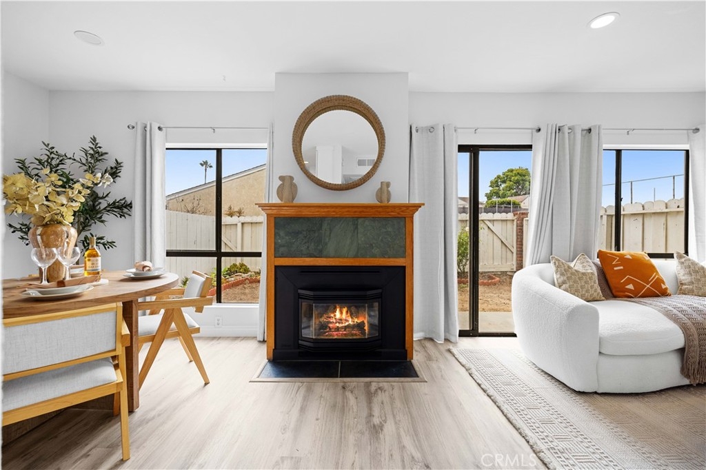 Beautifully remodeled 2-bedroom, 2-bath, single-story, ground-level end-unit condo in the gated community of Dana Light, set in a peaceful location surrounded by lush greenbelts. This home offers the perfect blend of coastal charm and contemporary comfort. Step inside to a bright, open living space with new laminate flooring, recessed lighting throughout, and a cozy fireplace. The kitchen features quartz countertops, custom cabinetry, stainless steel appliances, and tile flooring. The primary suite offers a private retreat with an oversized walk-in closet and a brand-new remodeled bathroom with a frameless sliding shower door and modern tile finishes. The secondary bedroom is spacious with abundant natural light, and a second full bath is conveniently nearby. Additional features include a brand-new water heater, in-unit laundry, a one-car garage, and one covered carport. Dana Light residents enjoy resort-style amenities including a pool, spa, tennis courts and landscaped grounds. HOA covers water, sewer, fire insurance, exterior maintenance, and gated security. Just one mile from Strands Beach and Dana Point Harbor, this turn-key condo offers easy access to coastal trails, dining, shopping, and the Lantern District. Perfect as a primary residence, weekend retreat, or investment, it embodies the best of Southern California coastal living.