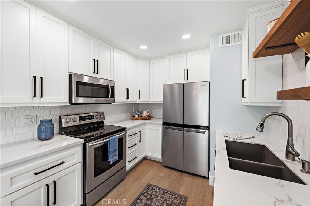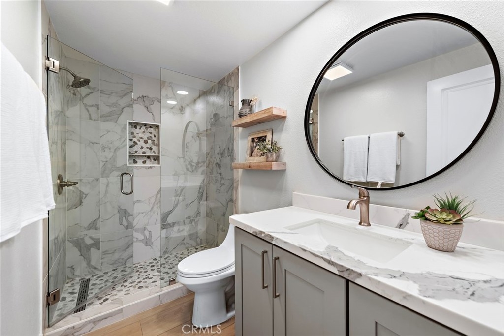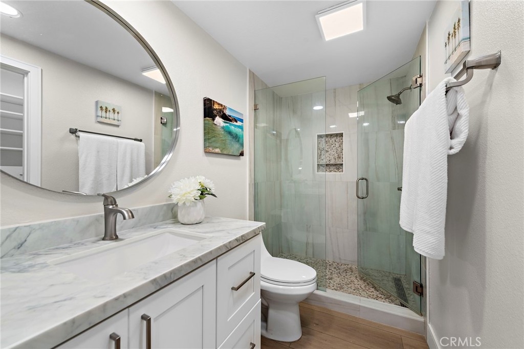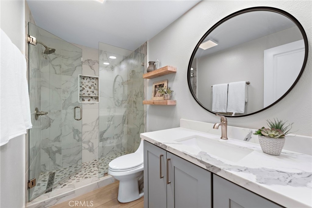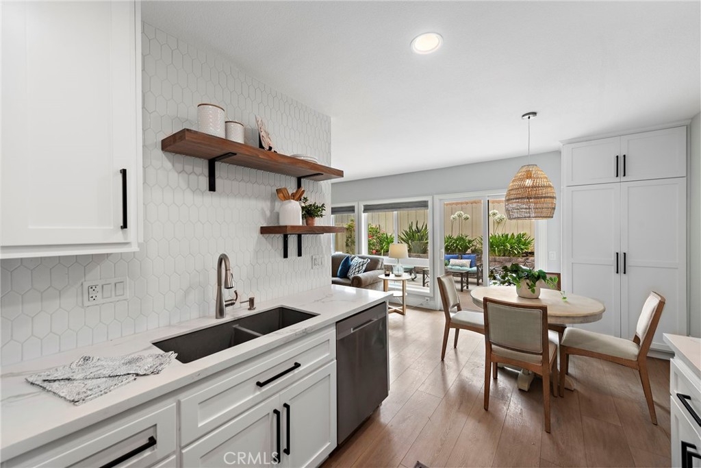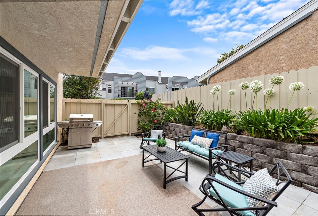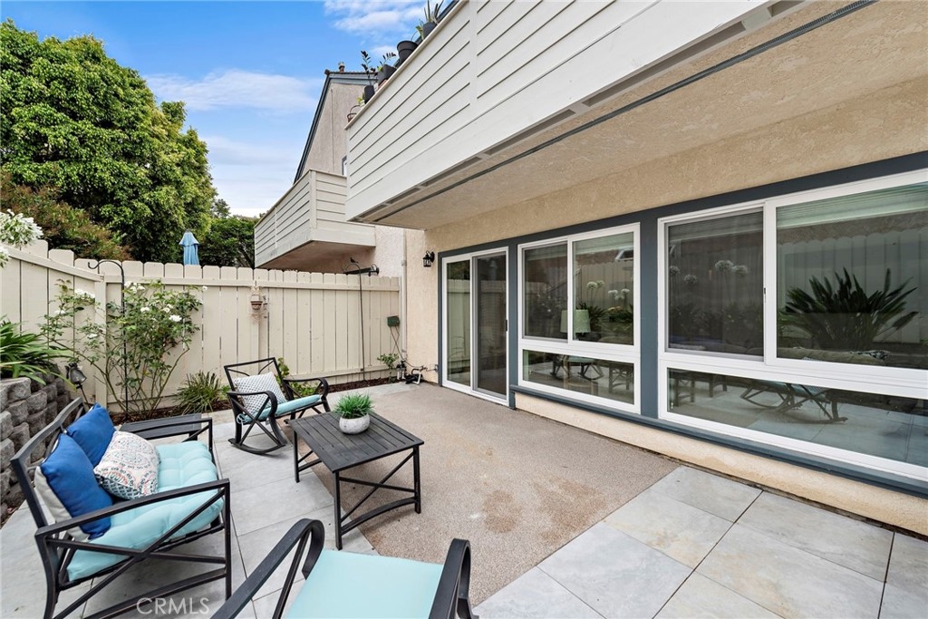CHARMING DANA POINT BEACH BUNGALOW IN GATED COMMUNITY! Welcome to coastal living at its finest! This beautifully remodeled 2 bed, 2 bath ground-level condo is less than 1 mile from Dana Point’s pristine beaches, nestled in a gated community near the harbor and lantern district. Step inside to discover a completely renovated interior, highlighted by a brand-new kitchen featuring custom cabinetry, built-in pantry, stainless steel appliances, open shelving, and elegant white quartz countertops. Both bathrooms have been tastefully updated with custom showers and frameless glass enclosures. Professionally built-out closets maximize storage space, while the primary bedroom offers the convenience of a walk-in closet. Luxury vinyl plank flooring flows seamlessly throughout, enhancing the bright and airy atmosphere. Outside, a spacious, landscaped fenced backyard creates a private oasis perfect for relaxation and outdoor gatherings. This turnkey bungalow offers the perfect blend of modern luxury and coastal charm, with easy access to beaches, dining, shopping, and entertainment. Don’t miss your opportunity to own this meticulously crafted home in one of Dana Point’s most sought-after locations!