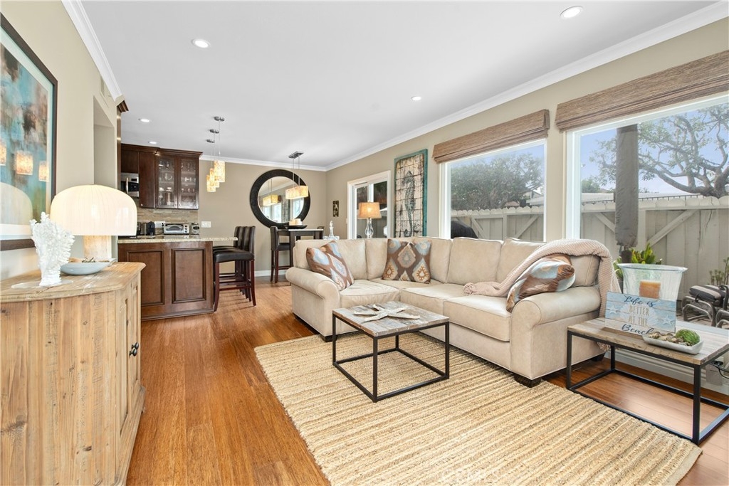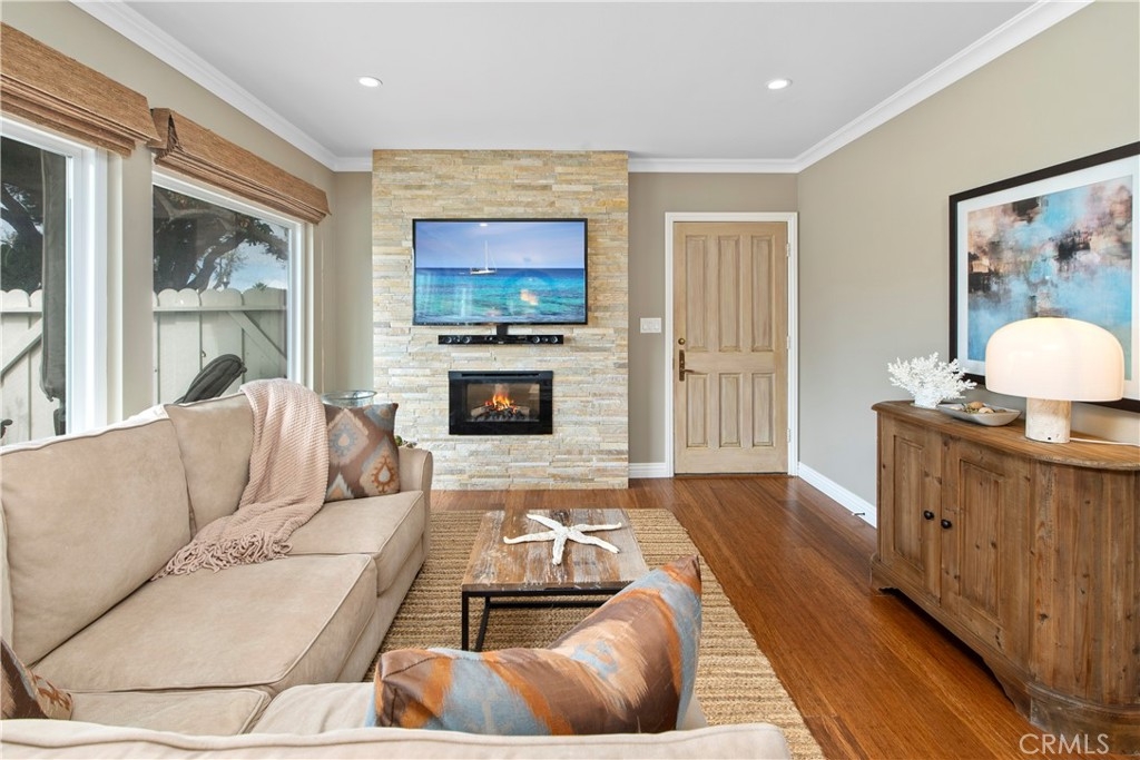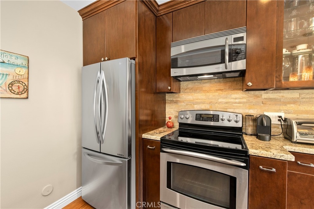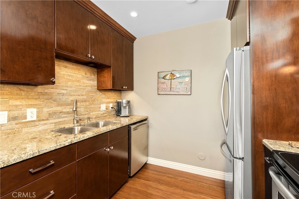 Located in the heart of coastal Dana Point and so close to beautiful Strands Beach, downtown shops and restaurants and 5 star resorts, The Ritz Carlton and Waldorf Astoria. This turn-key, 2 bedroom. 2 bath home is perfect and nestled privately in the gated community of Dana Light which includes pool and spa, sport court, tennis and pickle ball courts and beautiful grounds with large green belts that are pet friendly. The home is one-level and on the ground floor giving you a nice backyard patio with gate access to the community grounds. The heart of this home unveils itself with beautiful flooring, a stacked stone accent wall with fireplace, beautiful crown molding, custom window treatments and recess lighting casting a cozy ambiance that resonates throughout. The upgraded kitchen becomes a culinary haven, boasting an attractive granite countertop, a charming, stacked stone backsplash, stainless steel appliances and rich wood cabinets that are timeless. The bedrooms are great sized with a tremendous amount of natural light. The primary bedroom has a very large walk-in closet with built-ins. The secondary bedroom has built in closet with drawers and an office desk and storage with murphy bed, perfect for guests. Upgraded double-pane windows throughout. This beautiful home includes a one car private garage and an additional private covered carport. Perfect as a primary residence, second beach home or investment property. Enjoy the coastal lifestyle and all the benefits Dana Point has to offer.