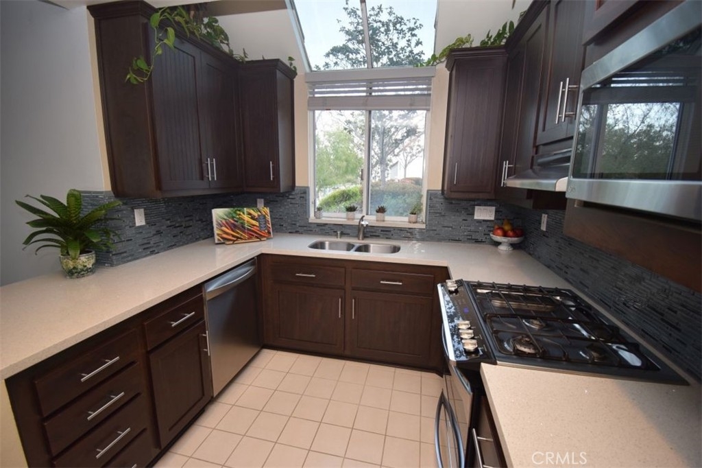 Single Story - NO STEPS! Located in the highly desired gated community of Encantamar. Beautifully remodeled kitchen with 5-burner Whirlpool stove, stainless steel appliances, Bamboo Mosaic backsplash, and custom lighting. Large skylight window adds a lot of additional light. Open concept floorplan. Cozy gas fireplace in spacious living room - with both living room and formal dining room having slider entrance to the large balcony - great for entertaining! Master Bedroom has large walk-in closet with built-ins. City lights view an added bonus! Oversized detached two-car garage with built-ins. Walk to shopping, restaurants, Cinepolis movie theater, and more! Gated complex feels like a resort - with pool, spa, clubhouse, exercise room, etc.