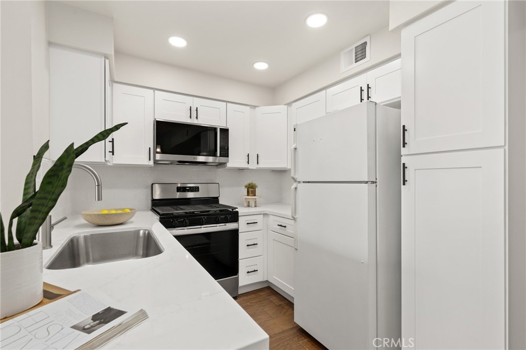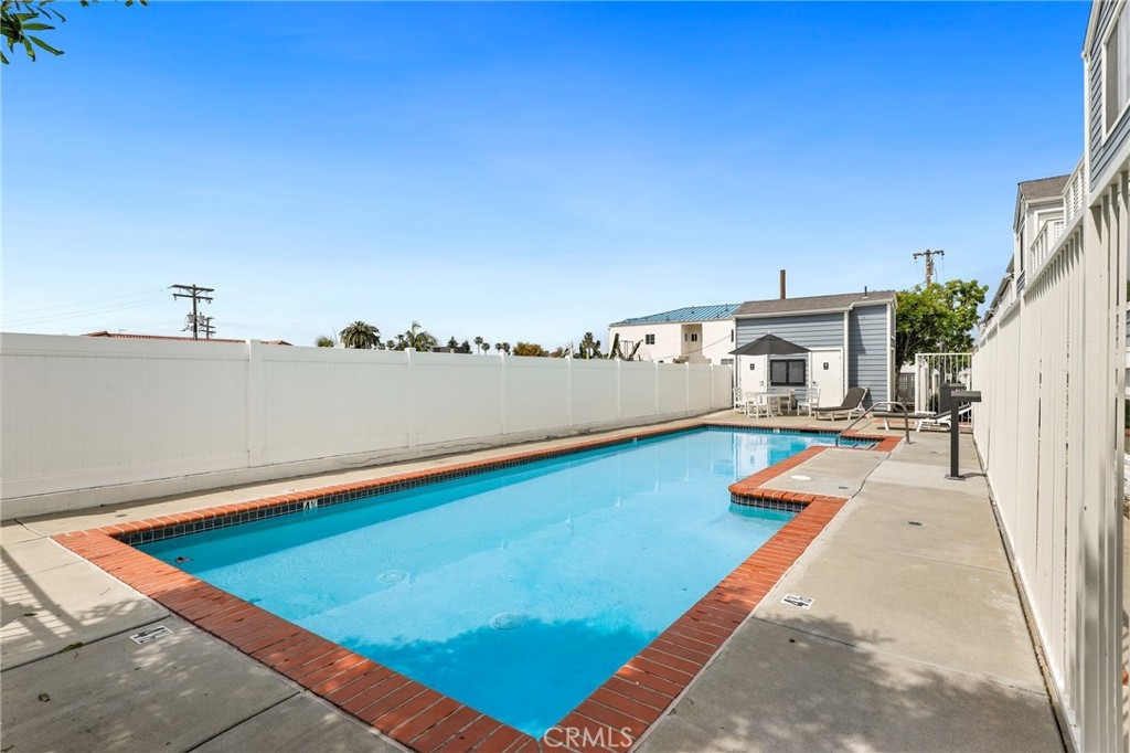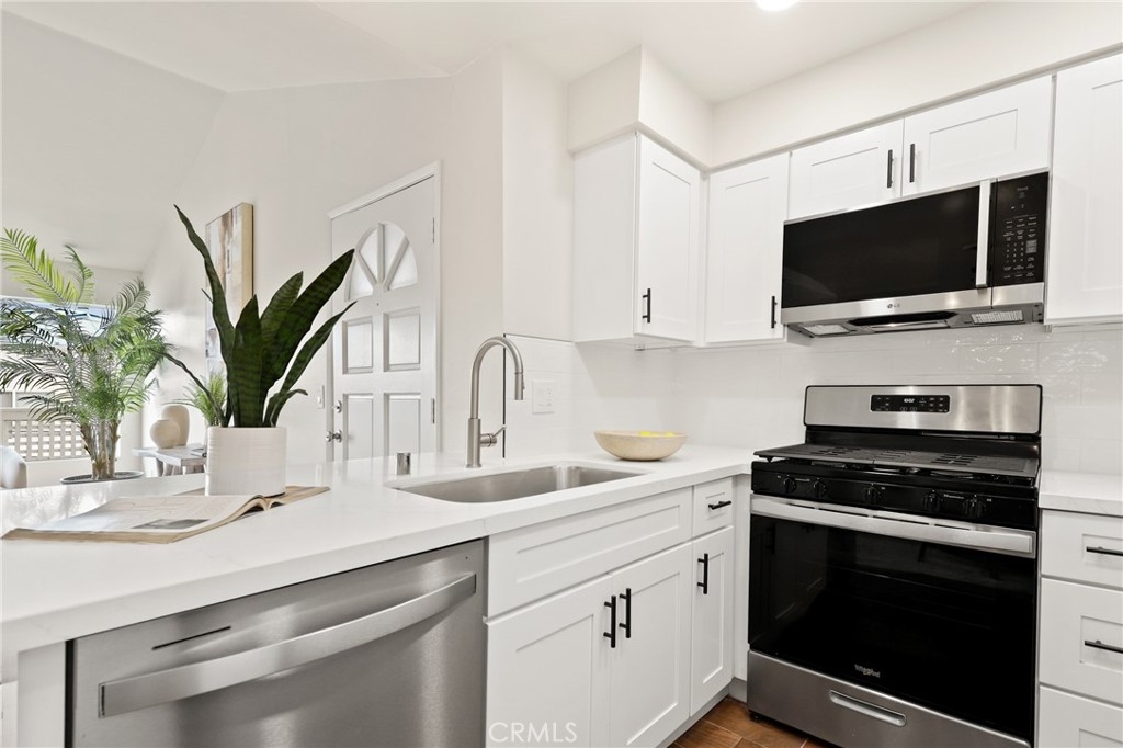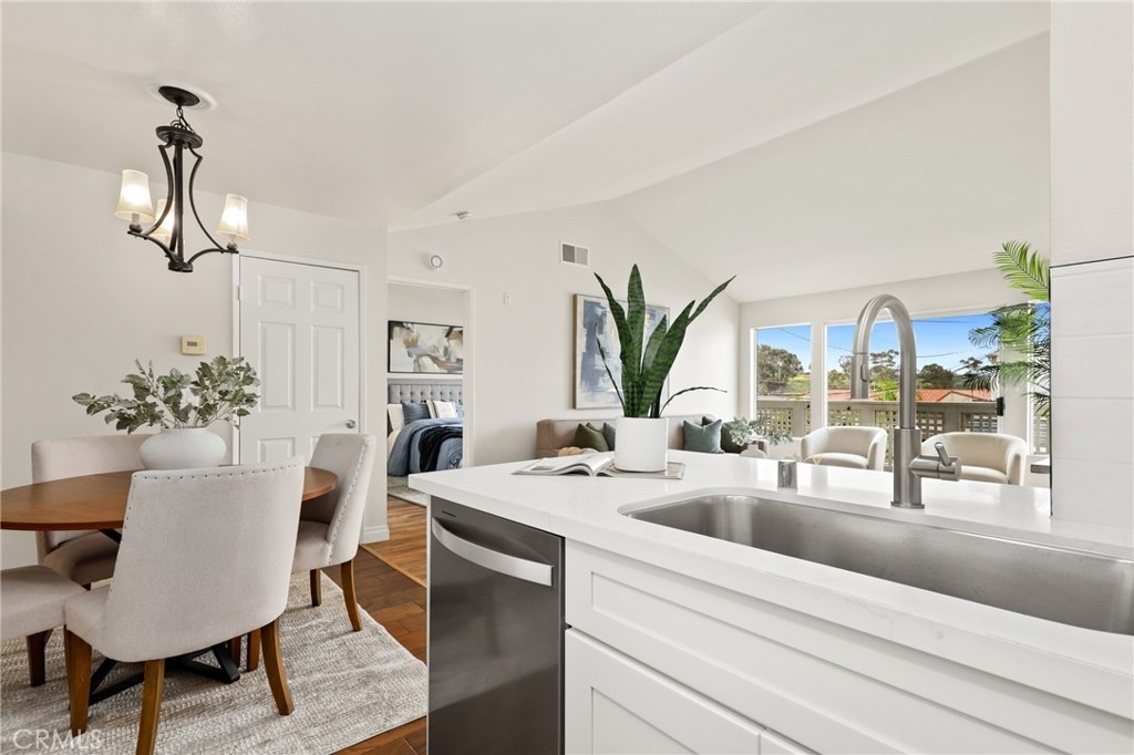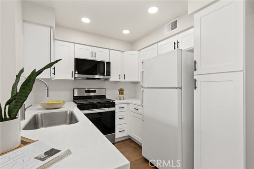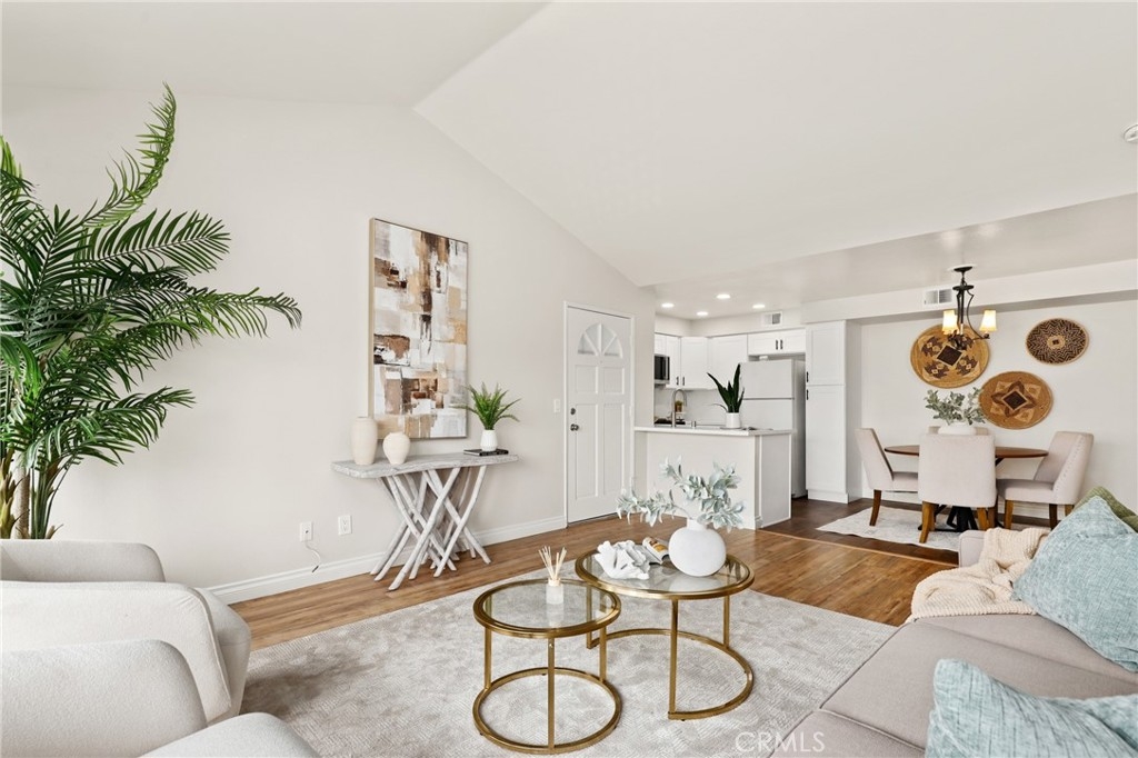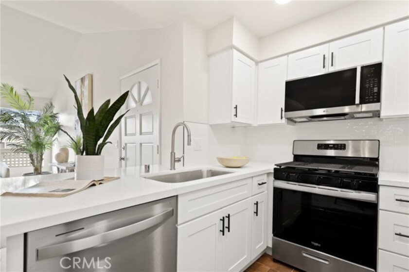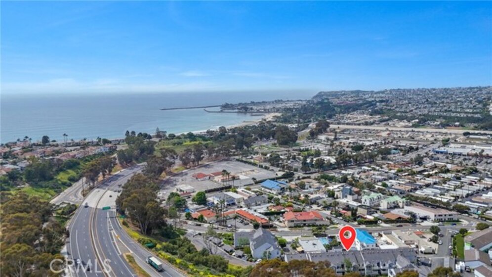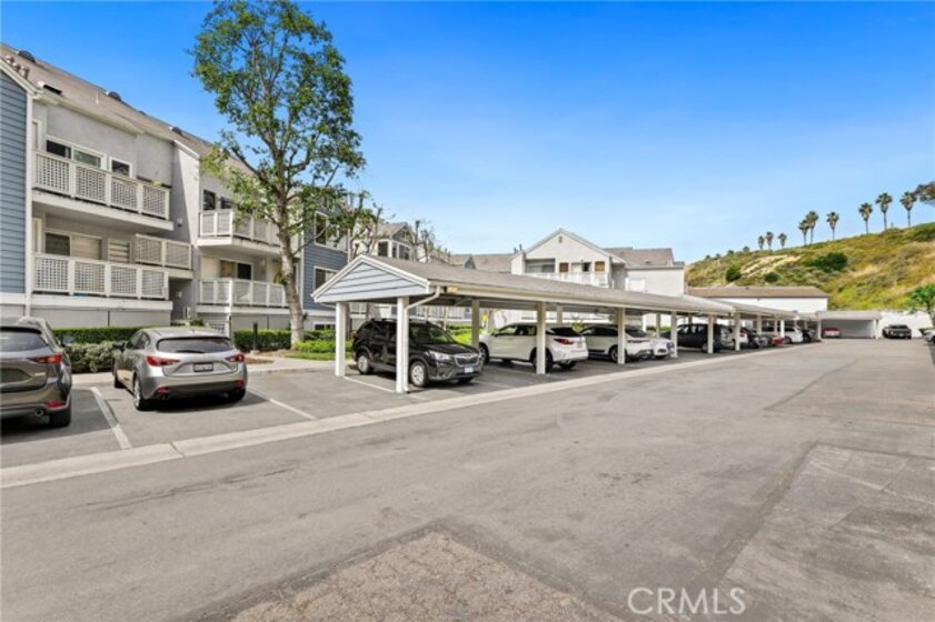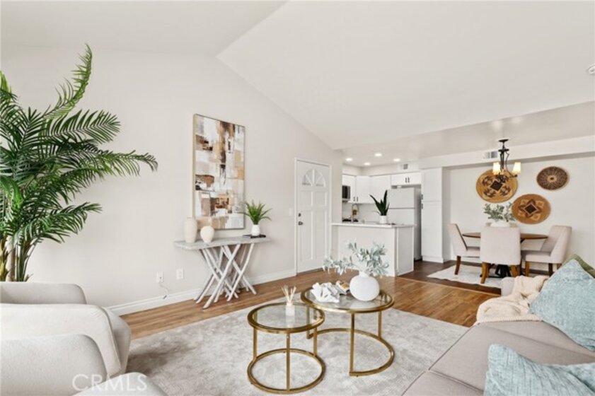Perched on the top floor in the desirable Harbor Walk community, this beautifully upgraded 1-bedroom, 1-bath residence offers approximately 700 square feet of light-filled living space with a fresh, modern feel throughout. Soaring cathedral ceilings enhance the open layout, while fresh interior paint and updated flooring create a clean, move-in-ready environment. The inviting living room flows seamlessly into a charming dining area and extends to a full-length private balcony with a retractable awning—perfect for relaxing or entertaining. The remodeled kitchen is a standout feature, showcasing rich granite countertops, white cabinetry, and ample workspace for both everyday living and hosting. The serene primary suite features vaulted ceilings, a spacious closet, and a well-appointed en-suite bathroom with granite surfaces and a mirrored vanity. Additional highlights include an assigned carport and access to the community pool. Ideally located just about a mile from the beach, with quick access to the 5 Freeway and surrounded by an abundance of shopping and dining options, this home offers an exceptional blend of comfort, style, and coastal convenience.