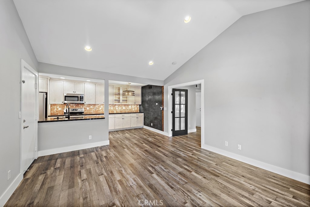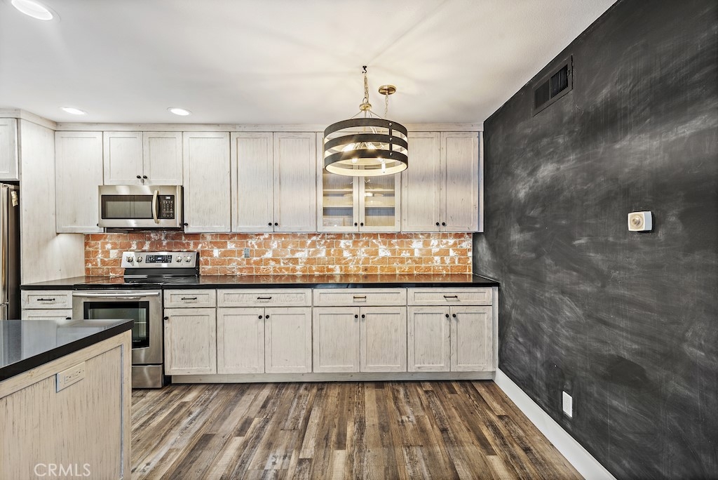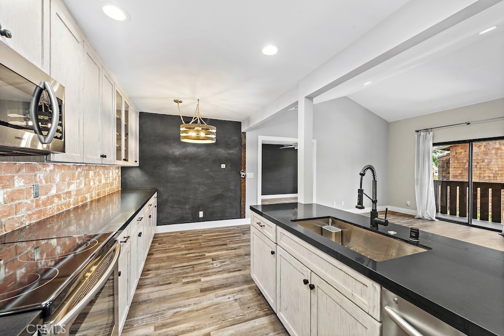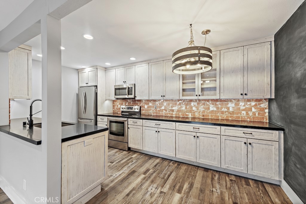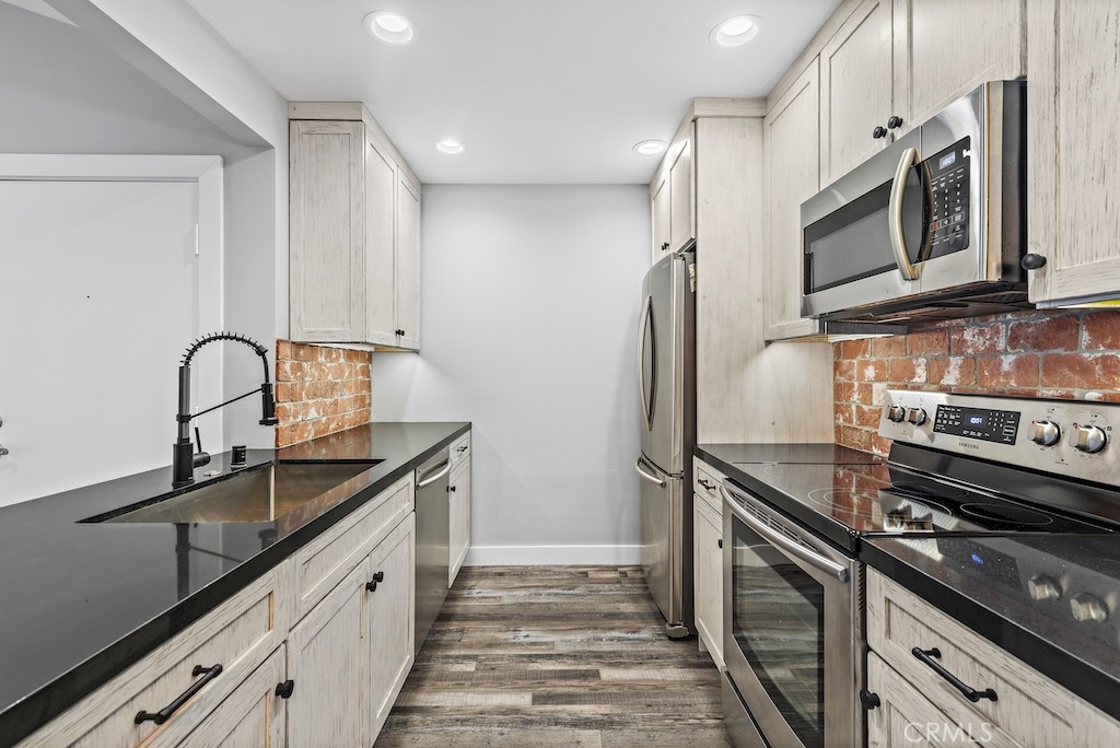 Fully renovated beach condo located in the gated, Harbor Creek community in the heart of Dana Point. Sought-after upper level unit has just been completely remodeled with nearly $100k in designer finishes! Upgrades include new wood-look flooring throughout, new baseboards, recessed lighting, fresh paint, and new air conditioner with wifi. The wall between the kitchen and living room has been opened and the kitchen ceiling was raised, making a great, spacious area for entertaining. The kitchen features gorgeous new kitchen cabinets with under cabinet lighting extending the length of the back wall, quartz counters, stainless appliances, chic brick backsplash and abundant storage. Glass french doors lead to the good size bedroom with modern black shiplap wall, large walk-in closet, and remodeled bath complete with walk-in shower. The serene balcony off the living room overlooks the creek and has no other inward facing units across from it, offering total privacy. Side by side laundry is conveniently located in a closet on the balcony. Wonderful community has just been fully re-piped and offers its residents a community pool/spa and close proximity to Dana Point via San Juan Creek Trail or Del Obispo St to Dana Point Harbor, Doheny State Beach, and renowned shopping and dining!