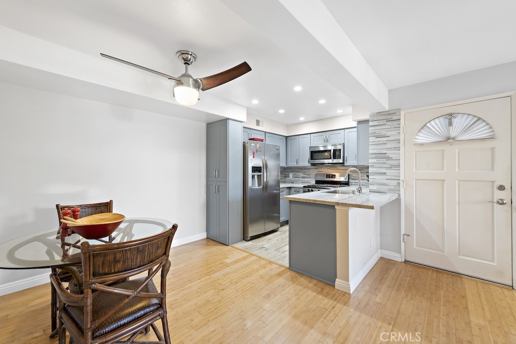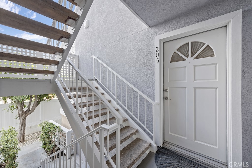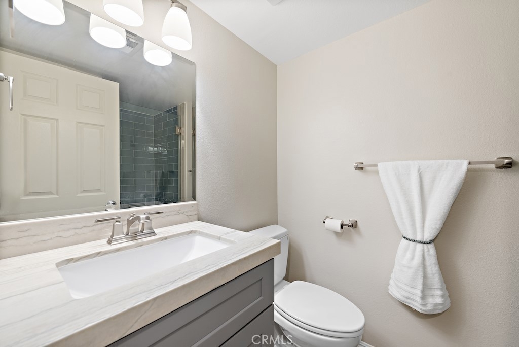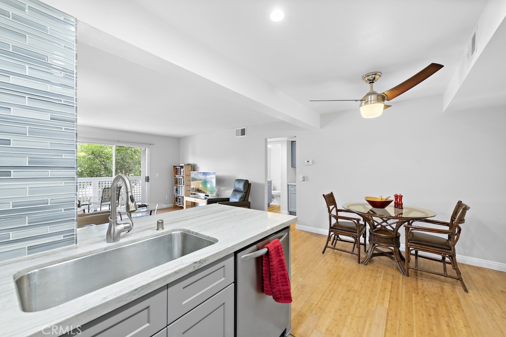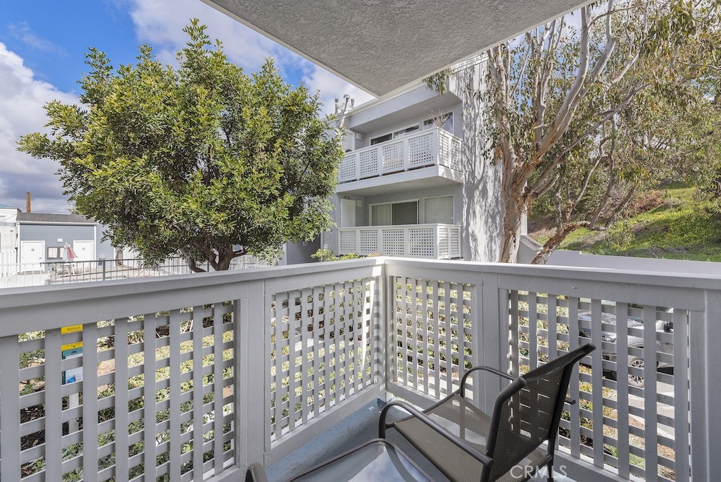Located in Dana Point's beach-close community of Harbor Walk, this rarely available two bedroom, 2 bath end-unit condo featuring two separate balconies has been extensively remodeled with designer finishes throughout. The bright and open kitchen boasts modern Ocean Grey Shaker Cherry cabinets, stunning white Macaubas Quartzite slab counters, glass tiled backsplash, stainless appliances, Italian wood-look porcelain tile flooring, recessed lighting, and brushed nickel Moen fixtures. The kitchen opens to a spacious dining area and living room, offering the ideal layout for entertaining. The two bathrooms have been tastefully updated with the same high end cabinets, counters and flooring as the kitchen,  and are complete with Canadian glass tiled showers with custom glass shower doors, 32" wide Kohler Archer bathtub in the master, Toto ADA toilets, new medicine cabinets, and more. Additional notable upgrades include a PEX re-pipe, gorgeous Brazilian bamboo flooring in the main living areas and high grade newer Stainmaster carpeting in both bedrooms, new modern ceiling fan in the dining room, fresh paint and baseboards, new water heater within the last year, and more- the list is truly extensive and this home is immaculately maintained. Harbor Walk offers its residents paid water and trash, a sparkling pool, and close proximity to the beach and downtown Dana Point.