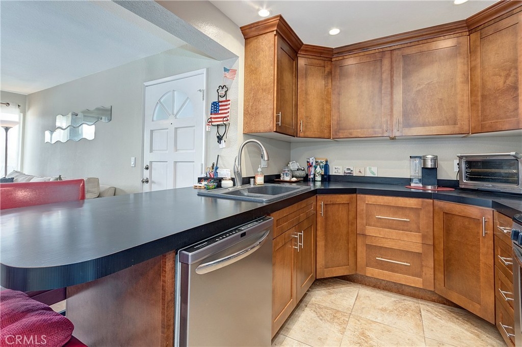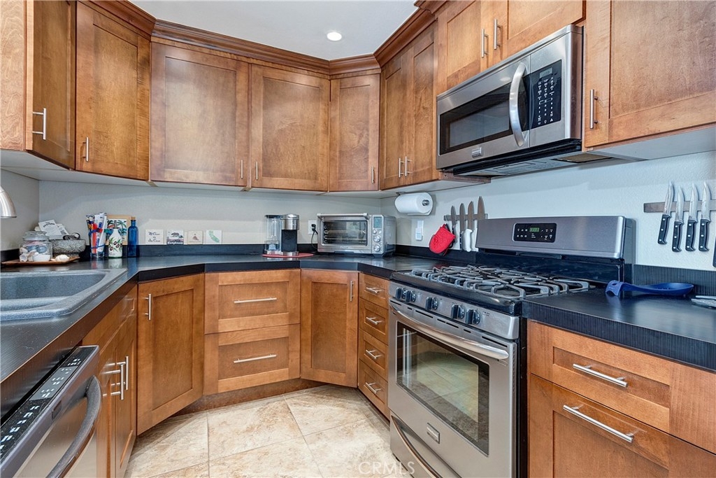 Located within one mile to restful beaches and Dana Point Harbor. Highly upgraded mid-level 2 bedroom, 2 bath home overlooks sparkling pool. Tasteful neutral tones throughout, re-designed gourmet kitchen with extensive custom cherry stained cabinetry, crown molding, stainless steel appliances, overhead lighting and ceramic tile flooring. Both baths have cherry cabinets and matching balcony mirrors and tile flooring. The hallway showcases a full length mirror. Light and bright - sliders in living room and master bedroom open to separate decks that welcome ocean breezes and beautiful sunsets. Updated electrical outlets and switches along with 3 ceiling fans add to the custom lighting and additional quality touches. Inside laundry closet with full size stackable washer/dryer hook-ups. Assigned parking with additional guest parking. Walk or bike to beach and shopping!