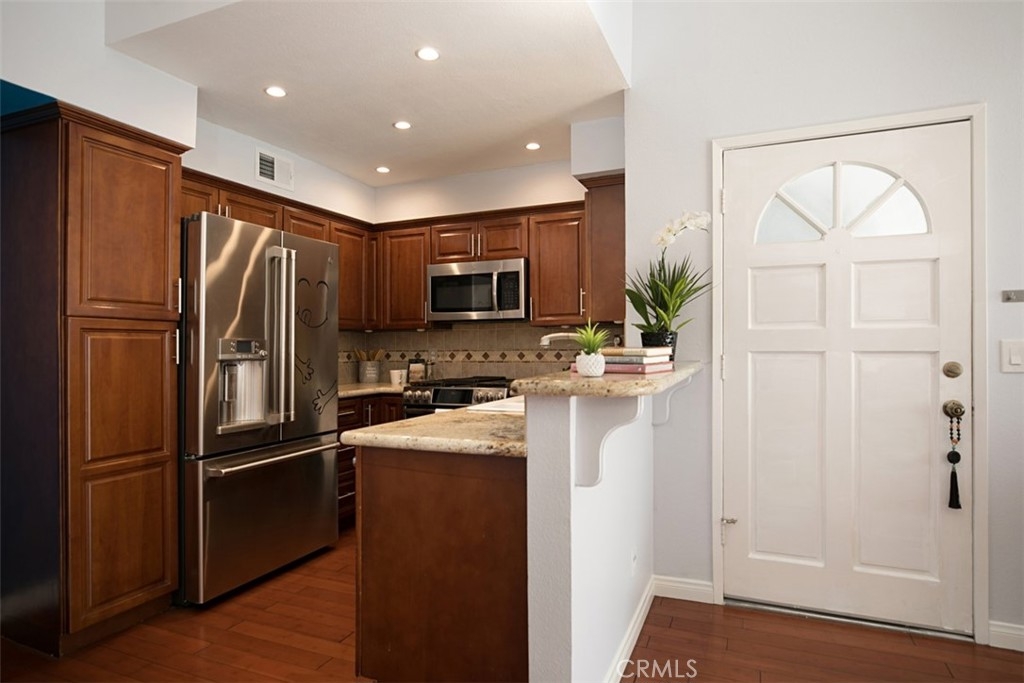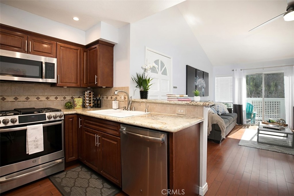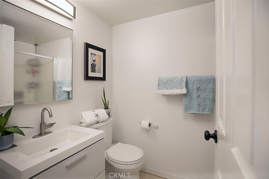 Southern California beach lifestyle awaits you at this newly updated hip modern community of Harbor Walk in Capistrano Beach–new home, 2nd home, or investment property! Minutes to Dana Point Harbor and surfing at Doheny State Beach, this turnkey remodeled top floor single level 2 bed 2 bath condo features an open concept kitchen, dining area and living room with warm wood laminate flooring. The vaulted ceiling, large windows, and slider to the balcony allow in fresh ocean breezes and California sunshine. Balcony is the perfect location for casual al fresco dining. Kitchen has rich wood cabinetry, granite counters, and newer stainless steel appliances. Adjacent to the kitchen is the dining area. The main bedroom is truly a retreat at the rear of the home with its own slider opening onto a separate balcony, walk-in closet, and adjoining updated bathroom with a shower tub. The spacious repainted guest bedroom with access to balcony is separated from the main bedroom by the updated guest bathroom with walk-in shower. Separate laundry room with stackable washer/dryer in the hallway. Updated light fixtures/ceiling fans, new carpet and recently repainted baseboards. Relax at the sparkling community pool or on nearby beaches, enjoy strolls around Dana Point Harbor, dining at local restaurants, and boutique shopping nearby. One reserved carport space #C49 and a 2nd open parking. HOA fee includes water and trash. Low tax rate and no Mello Roos. Capistrano Unified School District.