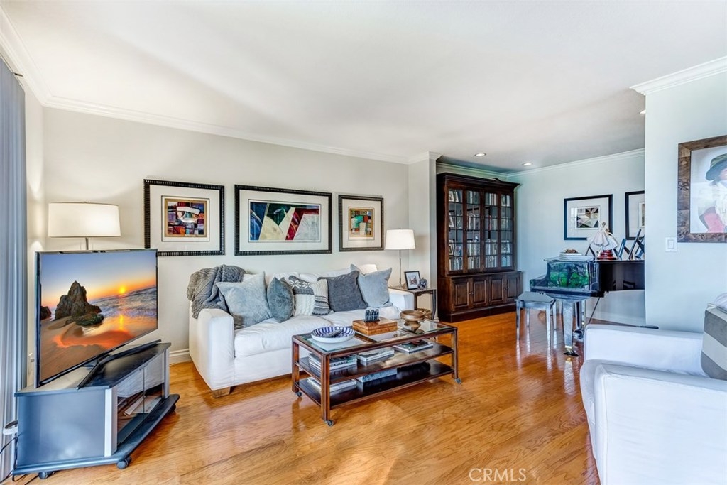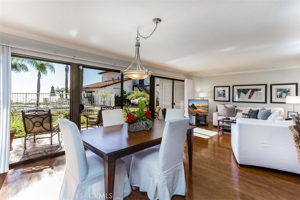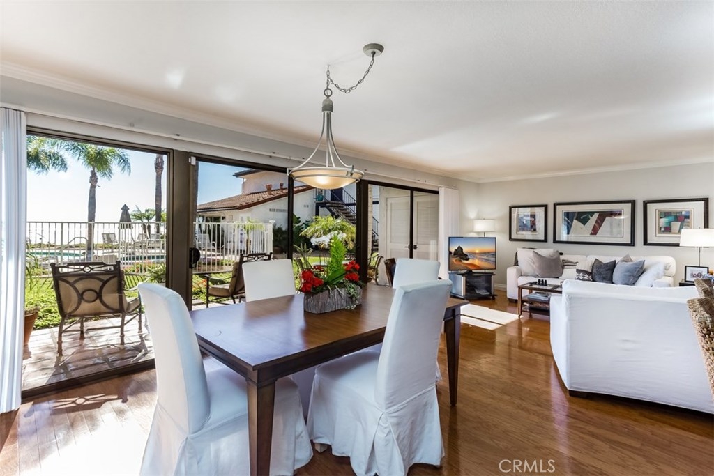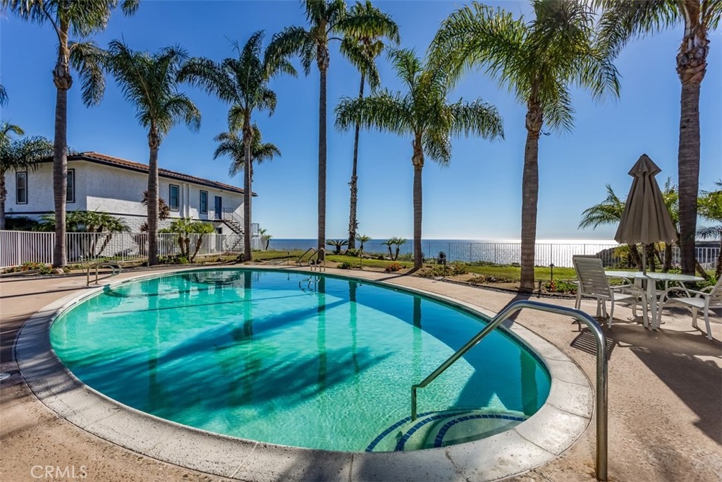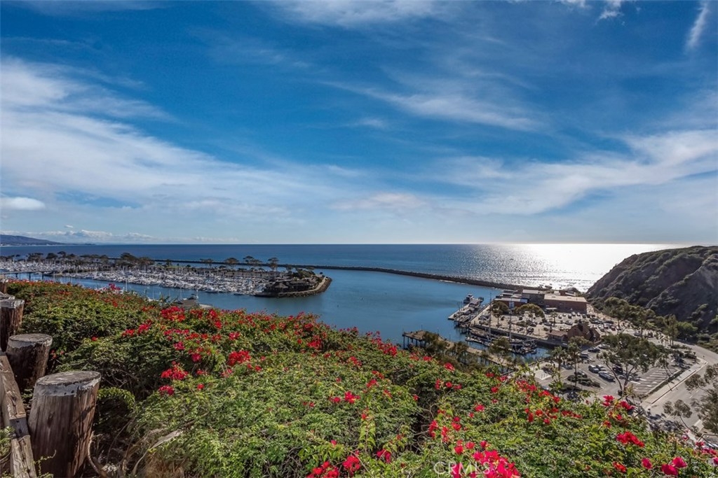 Resort living at it's best! Stunning ocean view condo is located on the main level perched on the bluff of Dana Point Harbor. This turnkey property has the look and feel of a tropical resort both inside and out. The interior boast gorgeous hardwood flooring throughout the living area. There is an expansive great room which makes up the living and dining area, as well as, a bonus room currently being utilized as a music room. The remodeled kitchen features Corian and stainless counters, cherry wood cabinetry and high-end stainless appliances.The master bathroom has been totally remodeled with double sinks, new soaking tub, marble counters and subway tiles. The master also features a walk-in closet with custom built-ins. The secondary bath is also remodeled with marble counters, new cabinets and lighting. A few additional upgrades are crown molding throughout, recessed lighting, large pantry and shutters in both bedrooms.This unit is just a few short steps to the immaculately maintained gardens, heated pool and spa and conveniently close to the clubhouse. The property offers incredible ocean views from the living room, dining room, and kitchen. This intimate gated community of only 34 units is located within walking distance to all of downtown Dana Point, Dana Point Harbor and the coastal cliff pathway to Strand Beach.The gated subterranean parking with two assigned spaces and locker storage is directly below the unit. Looking for big ocean view single level? You found it!