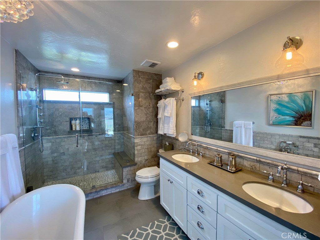 Exceptional beautifully remodeled Catalina ocean view and city lights home invites resort style living in Niguel Shores. Three bedroom two and a half bath home is ready for your pleasure. The great room and open kitchen-living room flow gently to the wall to wall views of the ocean. The folding window wall connects to the panoramic ocean view patio. The gourmet kitchen includes Thermador and Bosch appliances, wine fridge, pot filler over the 6 burner gas stove, new cabinets, Carrara marble inlay surrounded by hand crafted subway tiles. Pantry and extra storage space on the large center island bar enhance the entertainment experience. Upstairs, luxuriate in the ocean view master suite with spa-like bath, separate stone shower and dual sink vanity. Off the master enjoy deck views of Catalina sunsets and city lights views. Two more bedrooms and bathrooms are on the upper level. Air conditioning. Ample garden space on two sides. Two car garage. Niguel Shores offers bluff front park and parking for the beach at Strands, junior Olympic size pool heated all year around, spa, four tennis courts and playground. Nearby resorts include the Ritz Carlton, Monarch Beach Resort and Montage Hotel. Numerous restaurants in Dana Point, its harbor and Laguna Beach.