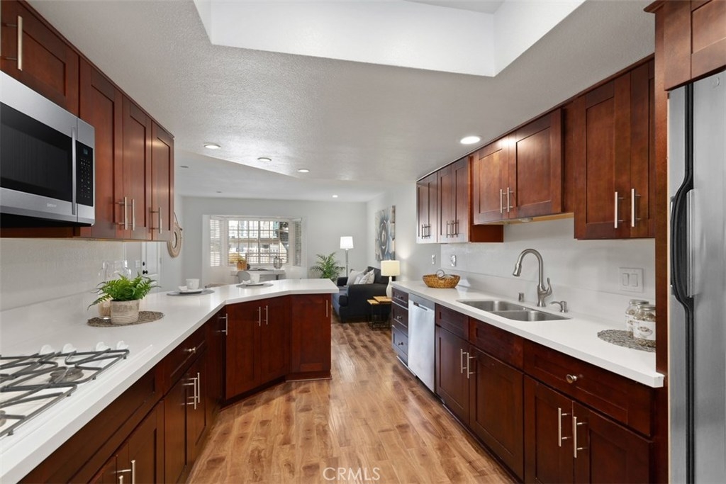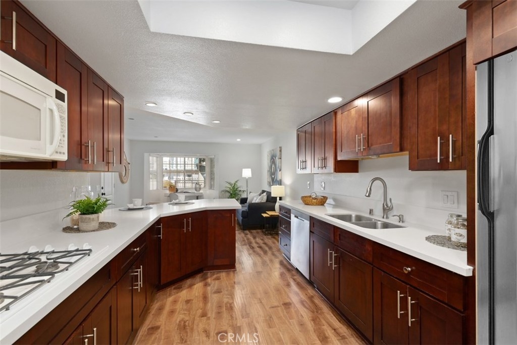 This fully upgraded, beach close, corner-unit condo shares a street with multi-million-dollar ocean view bluff homes, in a rare flat-street neighborhood within Dana Point. Featuring 2 bedrooms, 2.5 baths and 3 different patios for a total of 2114 square feet, this desirable unit enjoys close proximity to the harbor and all of the excitement and convenience the iconic Lantern District has to offer. Enter to a spacious living room with fresh paint, recessed lighting, trendy wood style floors, and a cozy fireplace. A sliding glass door takes you out to your private patio to enjoy the crisp ocean breeze. The chef's customized kitchen features wooden Shaker cabinets, upgraded hardware, stainless steel appliances including double ovens, sleek white countertops, an abundance of storage, and a breakfast bar which opens the space directly to a den area. Connected to the den is a laundry room with more wooden Shaker cabinets and hardware to match the kitchen. All bedrooms are located upstairs, each with its own ceiling fan and private balcony. The spacious master suite includes a warming fireplace, balcony, walk-in closet, and attached bath featuring a full soaking tub, and dual sink vanity. as a private corner-unit, the property includes a secluded side entrance with an additional wrap-around front patio. This coveted location with charming, tree-lined streets, wide -sidewalks, intertwined stairs through Heritage park leading to the Harbor. This Trophy property won't last long!