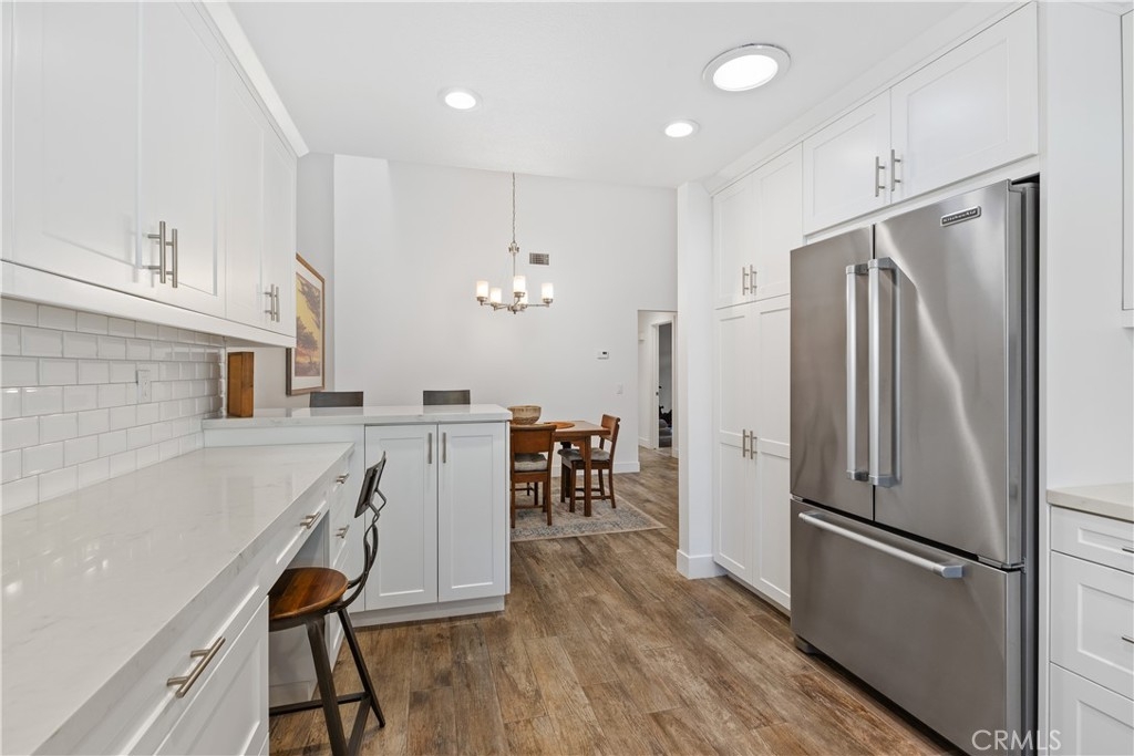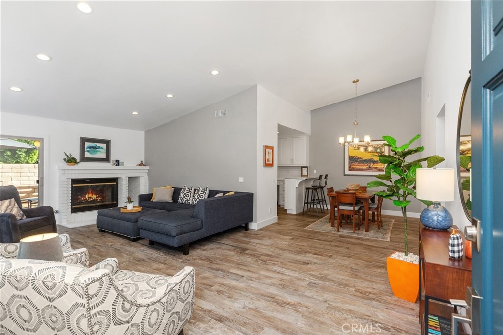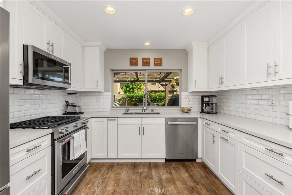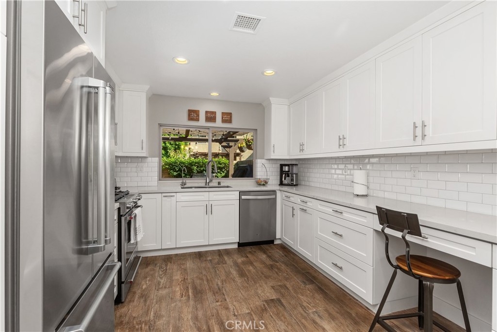 This popular single level floor plan has been transformed into the dream home you have been waiting for. The remodel has been thoughtfully and meticulously designed with the features and amenities today’s buyers demand. You will love creating your special cuisine in this light and airy kitchen with gorgeous counters, stainless appliances, and features such as a built-in desk/workspace, soft close doors, pots and pans drawers, and pull-out shelves in the pantry. The ceiling was raised to accommodate taller cabinets which and add to the large and open feeling. A portion of the wall to the dining room was removed to allow for a breakfast bar and open concept living design. Vaulted ceilings in the living room and dining room are accented with LED recessed lighting. Designer lighting fixtures add to the ambiance. Entertaining will be a breeze as guests can wind from the entry to the spacious living room with a cozy fireplace to the outdoor patio area with room for Barbeques and gatherings. Plan B, the Beachcomber, had an option of a 3rd bedroom or a den that opens to the living room. This one has been redesigned to offer the 3rd bedroom. Another floor plan favorite is the Primary Bedroom with access to a second patio allowing for cool ocean breezes and plenty of light. Pamper yourself in this beautifully remodeled primary bath with cabinet, dual sinks, a linen closet, stunning counters, walk-in shower with a seamless glass door and gorgeous tile work. Also, another bath has been tastefully redone offering a tub/shower combination with a charming white vanity and matching linen closet cabinets, gorgeous counter tops, and tub tile work. Additional features include recessed lighting in all rooms and tile flooring throughout, newer dual pane windows and slider doors, newer skylight, and wide baseboards. Interior doors have been replaced with shaker style doors and contemporary hardware. The community provides pools and BBQ areas for your outdoor enjoyment. This end unit will offer privacy and views of the gracious grounds. The community is adjacent to a walking/bike path to Doheny Beach. Only minutes to the soon to be revitalized Dana Point Harbor makes the community a true find for those seeking the Coastal Beach lifestyle!