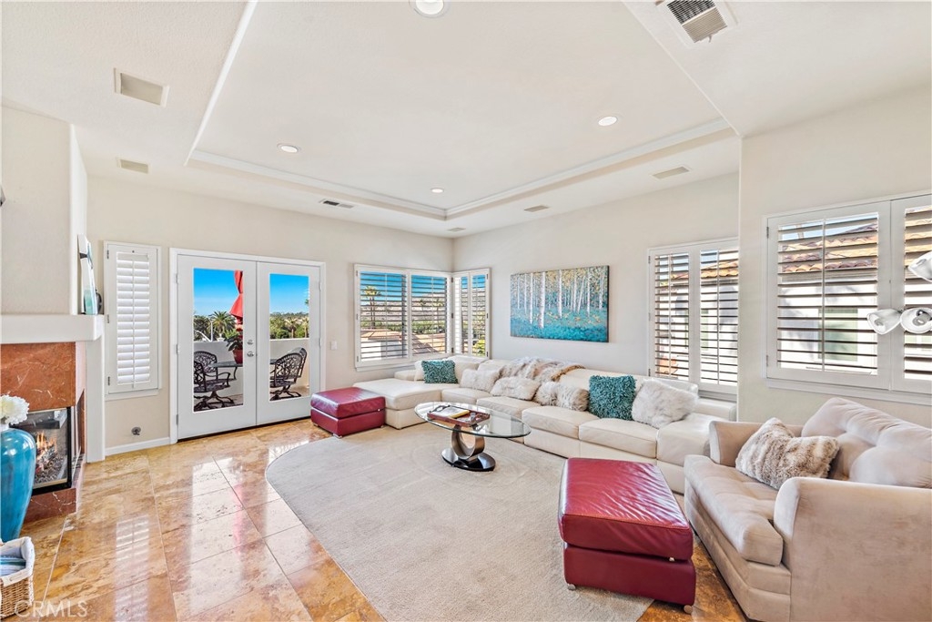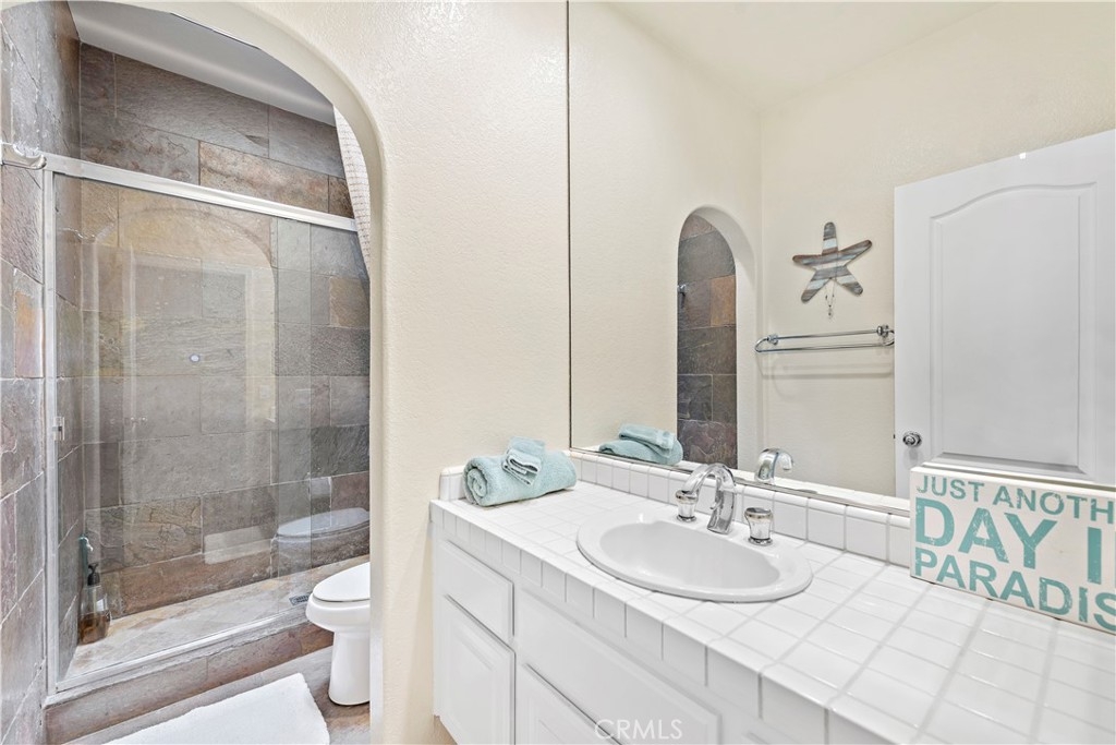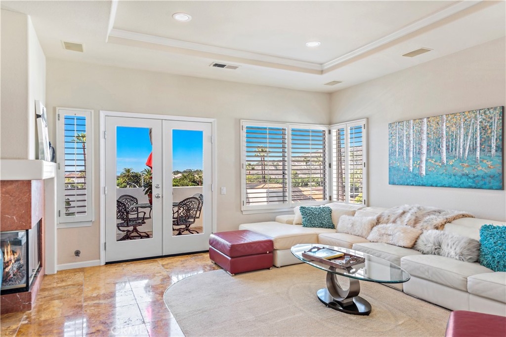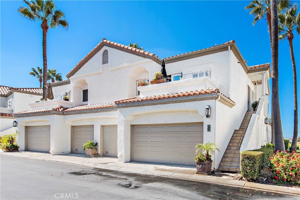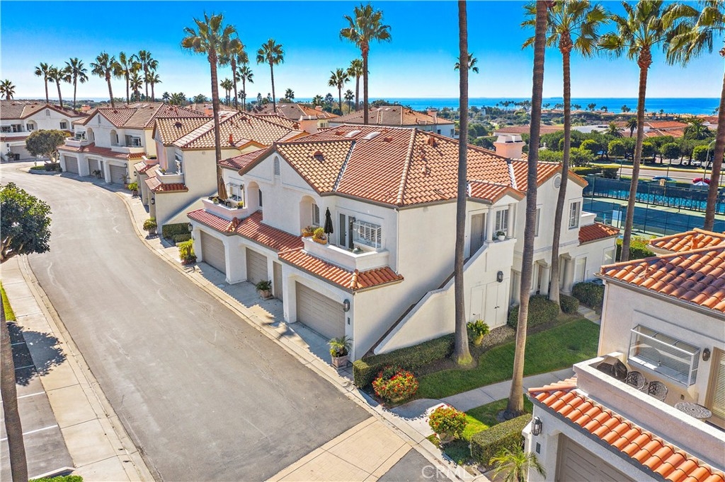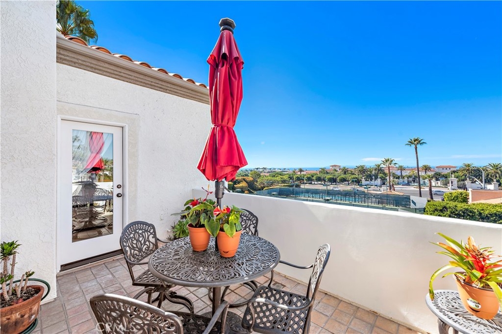 Welcome home to this beautiful upper Villa with ocean and Catalina Island views in the gated community of Tennis Villas. Great location across from the community pool, end unit overlooking the tennis courts and across to The Waldorf Astoria Resort with amazing ocean views. Dramatic entry with columns framing the living and dining rooms, travertine flooring, gas burning fireplace, recessed ceiling lights and beautiful dining room chandelier. Kitchen is light and bright with access to the front balcony overlooking the community pool. Living room opens to the large rear balcony with stunning ocean and Catalina Island views. Master bedroom also looks to the ocean and has a door to the ocean view balcony as well. Both bathrooms have slate tile flooring and showers – master bath with large oval tub and shower. You will notice the attention to details in this lovely home – plantation shutters throughout, arched entry into both bathrooms, recessed lighting, inside laundry room, and wood paneled closet doors. Two car garage has lots of storage closets and epoxy flooring. You will feel like you are on vacation every day!