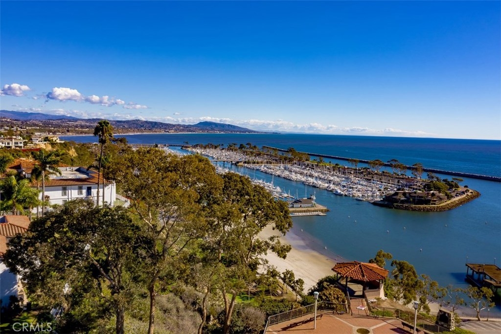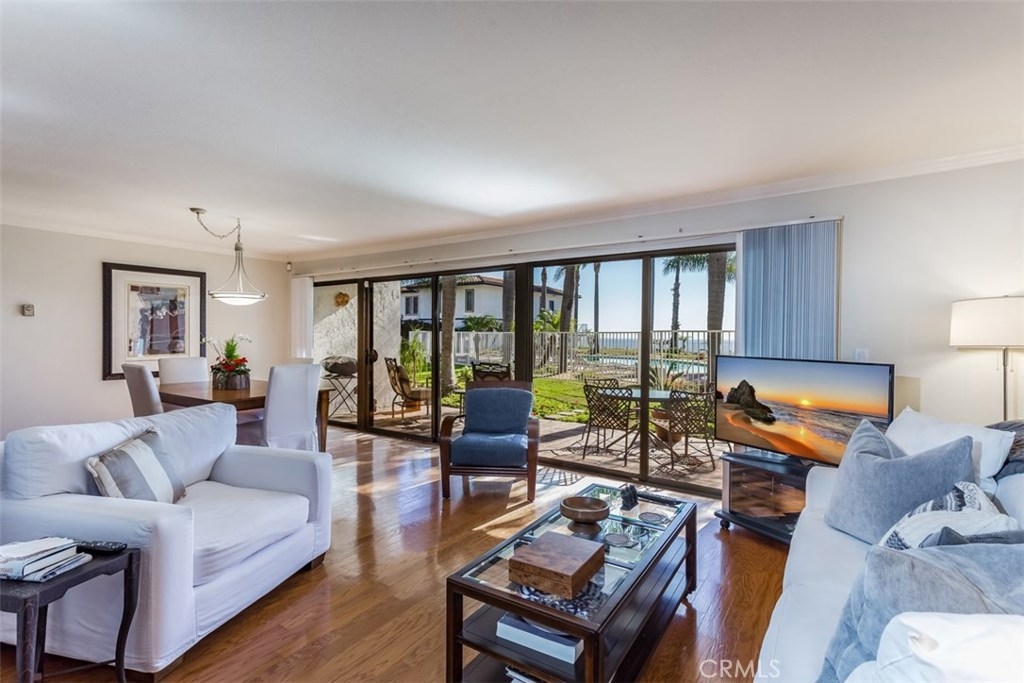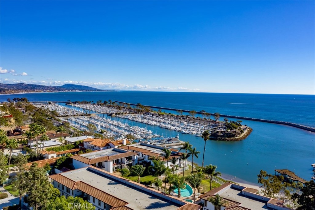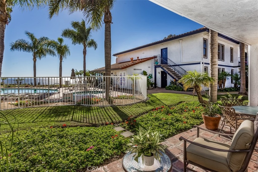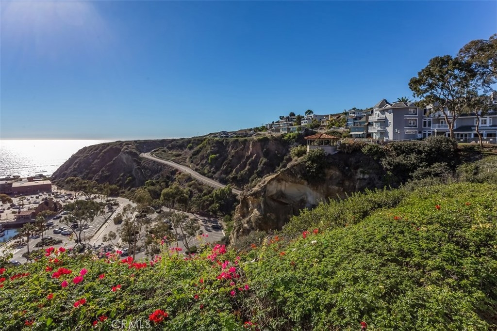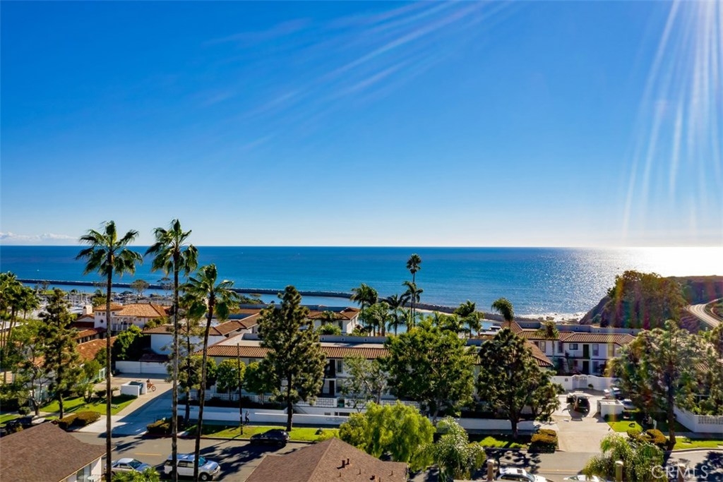 Resort living at it's best! Stunning ocean view condo is located on the main level perched on the bluff of Dana Point Harbor. This turnkey property has the look and feel of a tropical resort both inside and out. The interior boast gorgeous hardwood flooring throughout the living area. There is an expansive great room which makes up the living and dining area, as well as, a bonus room currently being utilized as a music room. The remodeled kitchen features Corian and stainless counters, cherry wood cabinetry and high-end stainless appliances.The master bathroom has been totally remodeled with double sinks, new soaking tub, marble counters and subway tiles. The master also features a walk-in closet with custom built-ins. The secondary bath is also remodeled with marble counters, new cabinets and lighting. A few additional upgrades are crown molding throughout, recessed lighting, large pantry and shutters in both bedrooms.This unit is just a few short steps to the immaculately maintained gardens, heated pool and spa and conveniently close to the clubhouse. The property offers incredible ocean views from the living room, dining room, and kitchen. This intimate gated community of only 34 units is located within walking distance to all of downtown Dana Point, Dana Point Harbor and the coastal cliff pathway to Strand Beach.The gated subterranean parking with two assigned spaces and locker storage is directly below the unit. Looking for big ocean view single level? You found it!