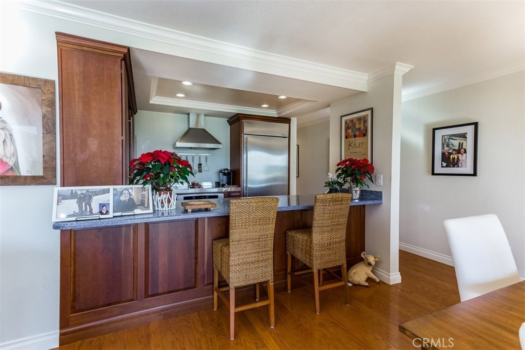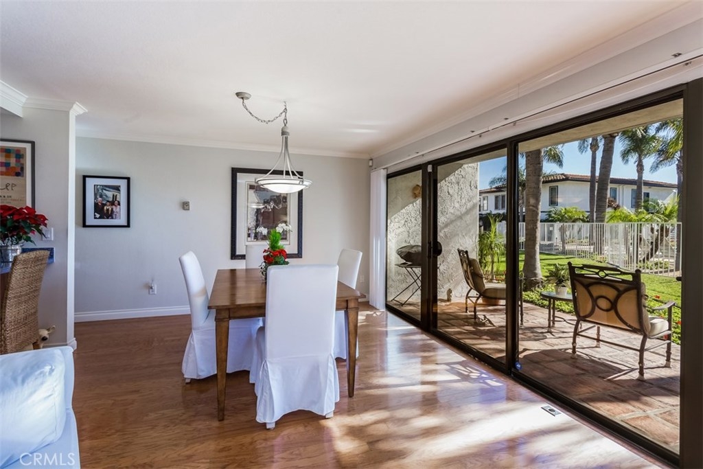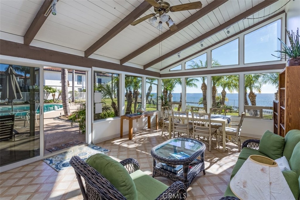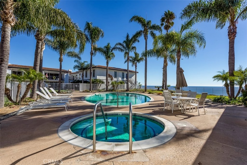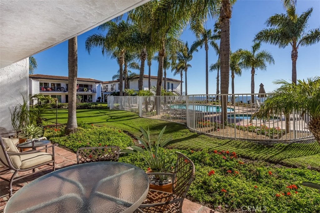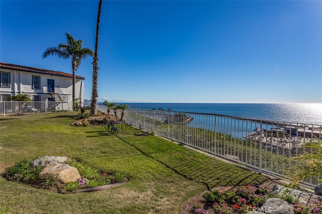 Resort living at it's best! Stunning ocean view condo is located on the main level perched on the bluff of Dana Point Harbor. This turnkey property has the look and feel of a tropical resort both inside and out. The interior boast gorgeous hardwood flooring throughout the living area. There is an expansive great room which makes up the living and dining area, as well as, a bonus room currently being utilized as a music room. The remodeled kitchen features Corian and stainless counters, cherry wood cabinetry and high-end stainless appliances.The master bathroom has been totally remodeled with double sinks, new soaking tub, marble counters and subway tiles. The master also features a walk-in closet with custom built-ins. The secondary bath is also remodeled with marble counters, new cabinets and lighting. A few additional upgrades are crown molding throughout, recessed lighting, large pantry and shutters in both bedrooms.This unit is just a few short steps to the immaculately maintained gardens, heated pool and spa and conveniently close to the clubhouse. The property offers incredible ocean views from the living room, dining room, and kitchen. This intimate gated community of only 34 units is located within walking distance to all of downtown Dana Point, Dana Point Harbor and the coastal cliff pathway to Strand Beach.The gated subterranean parking with two assigned spaces and locker storage is directly below the unit. Looking for big ocean view single level? You found it!