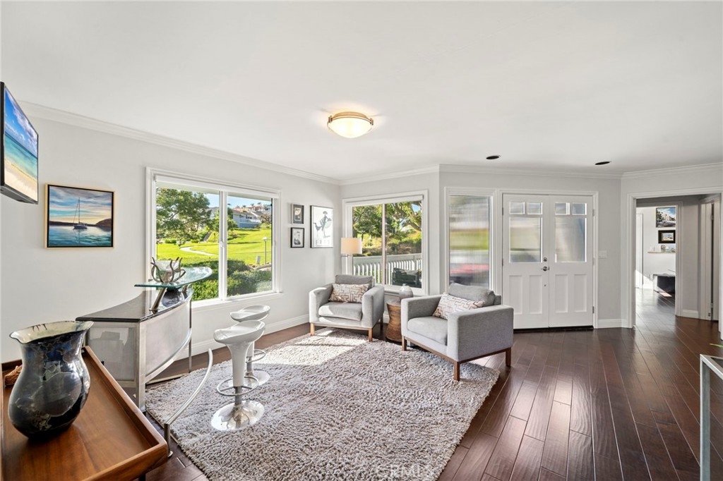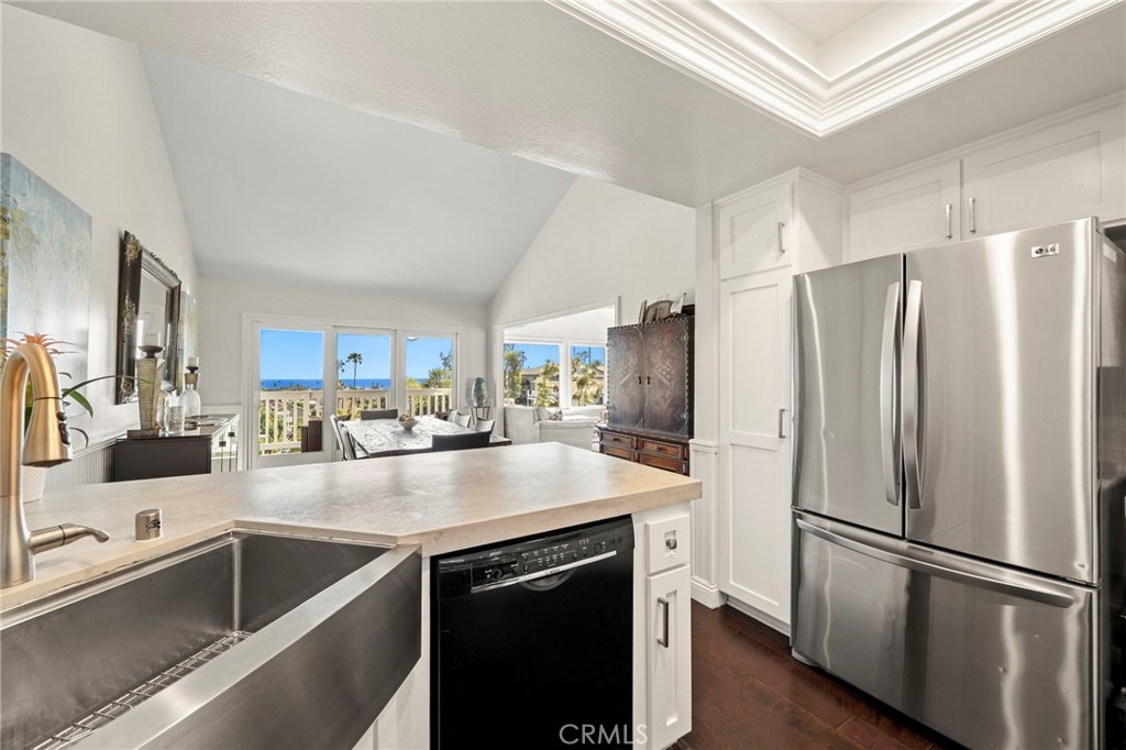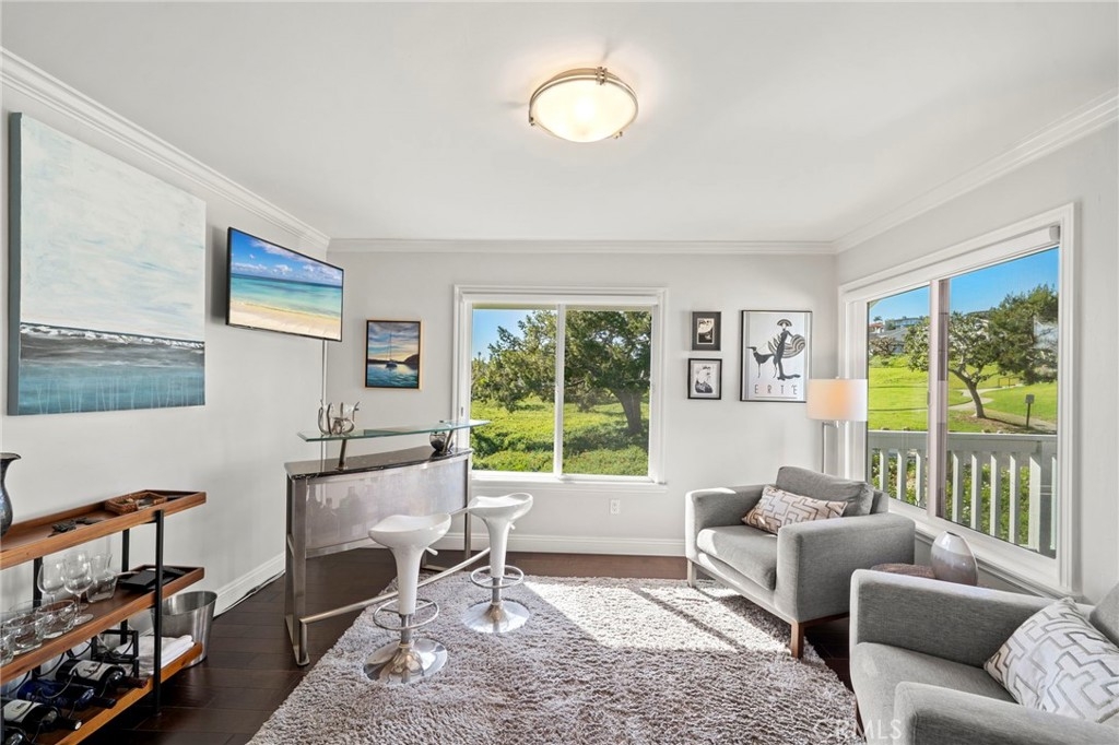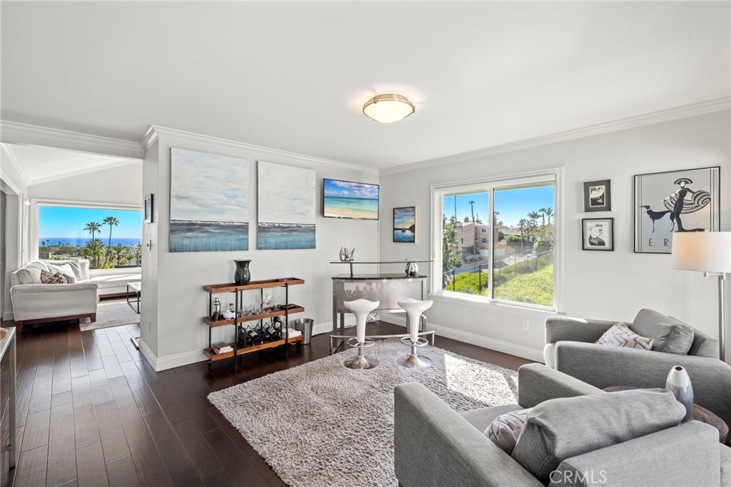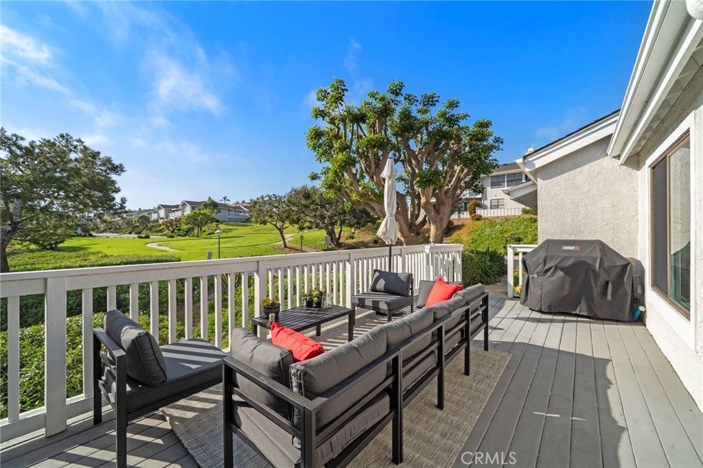 This premier first-row end-unit residence in Dana Point’s highly sought-after Sea Ridge community is ideally positioned along a tranquil greenbelt with ocean views from the main living areas and bedrooms. Few homes within Sea Ridge offer this combination of greenbelt frontage, ocean views, and end-unit privacy. The end-unit location provides a rare blend exceptional privacy, openness, natural light, and coastal vistas. Enter through double doors into a bright, inviting interior with abundant natural light, and expansive windows that frame both the lush greenbelt and the ocean beyond. The spacious family room with fireplace flows seamlessly into the dining area and kitchen, creating an ideal setting for everyday living and entertaining. Multiple balconies provide inviting outdoor spaces to enjoy sunset skies and ocean breezes, including a peaceful front patio overlooking the greenbelt, a private balcony off the dining area, and a spacious balcony off the primary suite. This thoughtfully designed three-bedroom home includes a custom primary bath with a luxurious shower, a dedicated laundry room, and a versatile office nook. The secondary bedroom features a private ensuite, while the main-floor bedroom has been converted into an office with direct access to the two-car garage. Sea Ridge has recently completed extensive community improvements, including exterior wood repairs, fresh paint, and a full community repipe with PEX piping. Ideally located minutes from Dana Point Harbor, beaches, scenic coastal trails, restaurants, and shopping, this home offers convenient access to the very best of the Dana Point coastal lifestyle. Benefit from the ongoing Dana Point Harbor revitalization, with current redevelopment underway to enhance the marina, commercial core, dining, retail, hotels, and public spaces. Opportunities with this combination of ocean views, greenbelt setting, and premier positioning in Sea Ridge rarely come available.