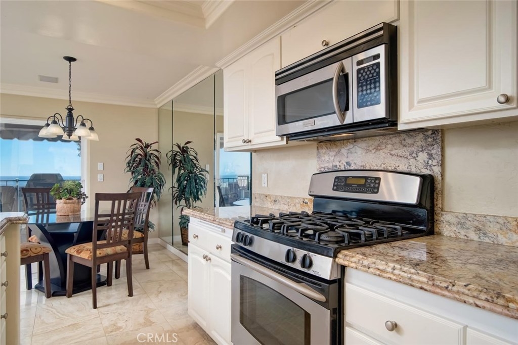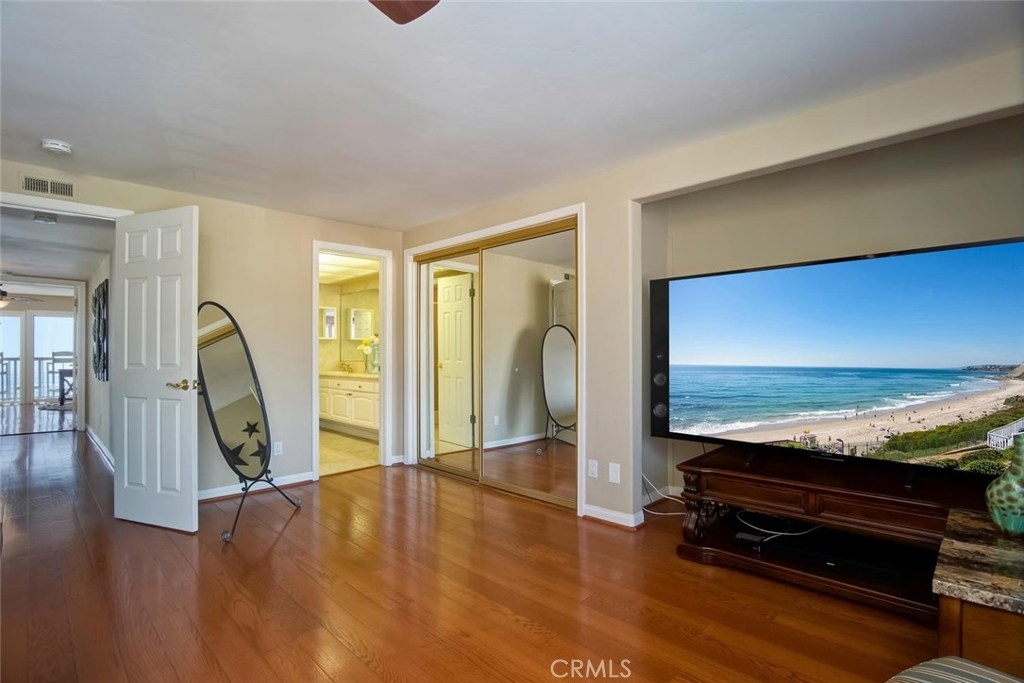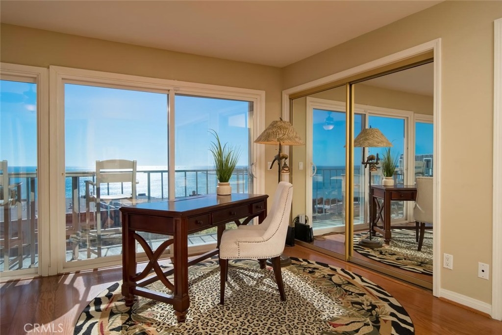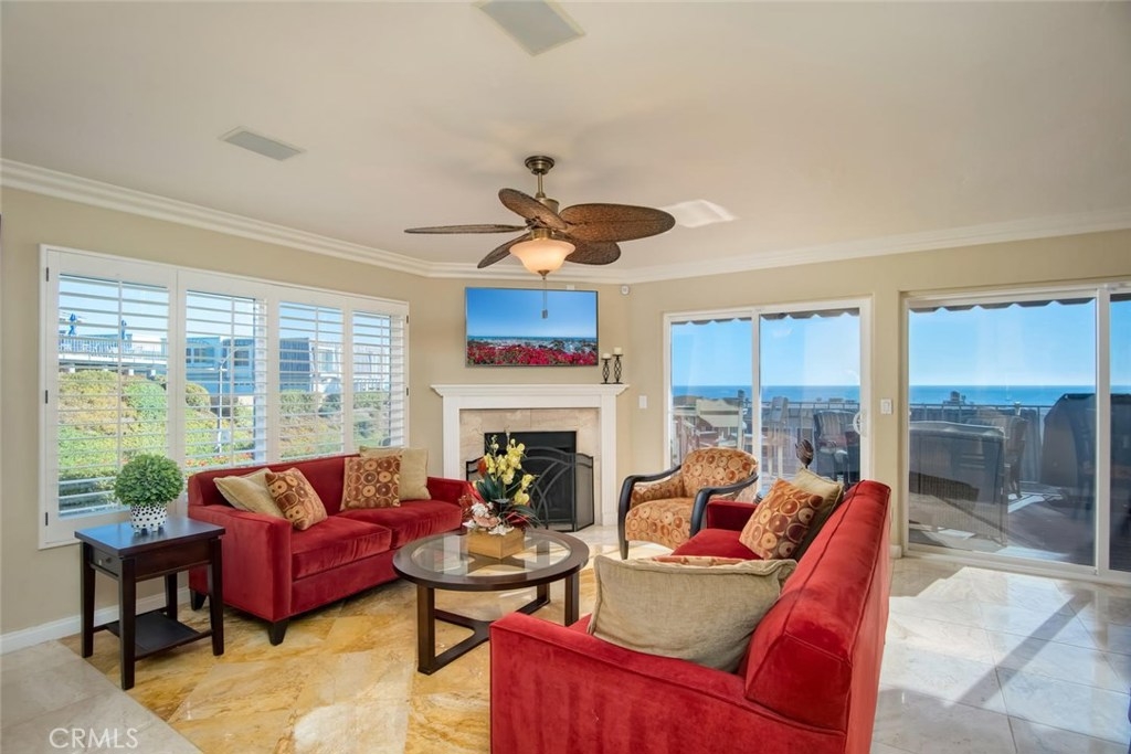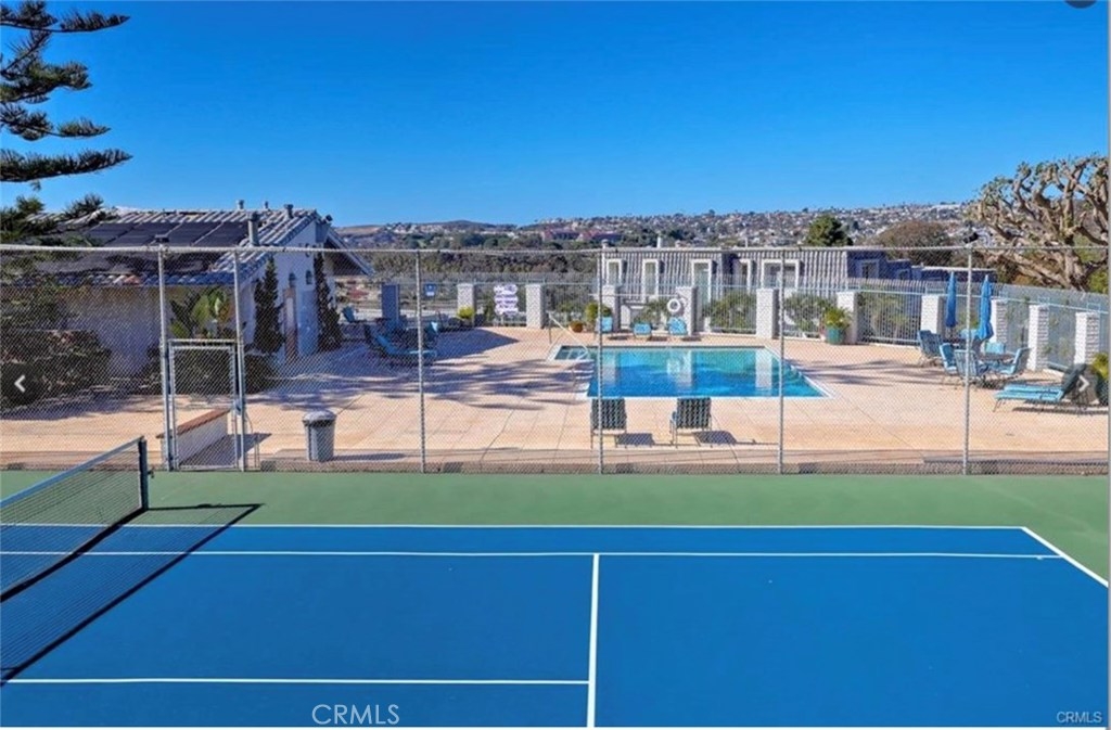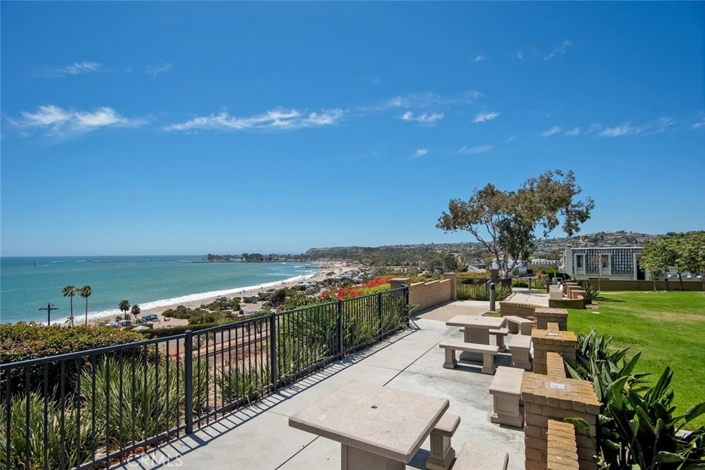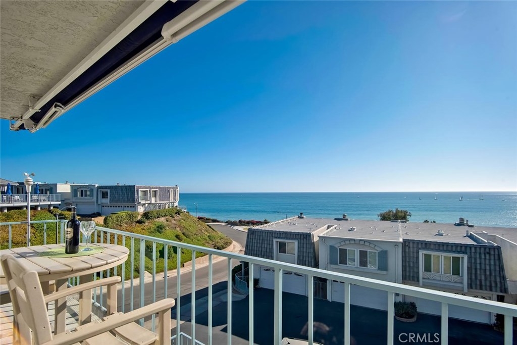 Panoramic ocean, whitewater and beach views from this beautiful property in Dana Point with 3 bedrooms and 2 ½ bath. Enjoy the resort lifestyle in this light and bright end unit with an open floor plan and breathtaking coastal and city light views from almost every room. Quality features include hardwood and stone flooring, crown molding, recessed lighting, tinted windows and ceiling fans. Upgraded kitchen features granite countertops, stainless steel appliances, new sink and refrigerator, counter seating and built-in buffet, and opens to the living room and dining area with fireplace and mirrored accent wall. Step through the sliding glass doors onto the sunny and spacious deck. Great for entertaining, barbequing and enjoying dramatic sunsets over the ocean and includes automatic sunshade awnings and composite decking. Huge master bedroom has dual closets and balcony with a new automatic sunshade awning. Master bath features dual sinks, walk-in shower and Jacuzzi tub. A second large upstairs bedroom has an en-suite bathroom and can be used as a second master bedroom. The third bedroom is smaller and currently used as an office and has ocean views. Owners have installed a new Life Source water system, new water heater and A/C unit and a new security screen door. Direct access 2 car garage. Located near association tennis courts, pool and spa. Walk to the beach and nearby Dana Point harbor, local shopping and restaurants.