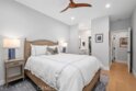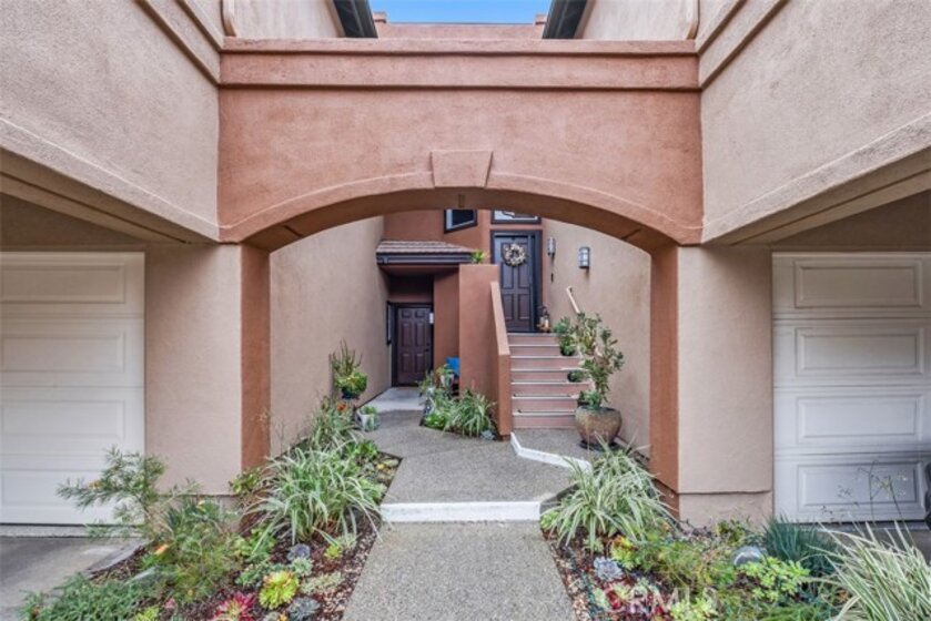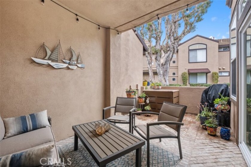 Prime Location! Recently completed top-to-bottom renovation! Fully furnished, turn-key, ground-floor, single-level located in a quiet, community walking distance to fine dining and two shopping centers, coastal close with a refreshing ocean breeze. Community pool and spa. This open-concept home features newly replaced hardwood floors, updated interior/exterior doors and beautiful custom windows, recessed lighting throughout, and a two-way gas fireplace with bi-fold glass doors. Modern kitchen includes quartz countertops, custom cabinetry, bar seating, and recently updated appliances: 6-burner range, dishwasher, disposal, microwave, refrigerator, and interior stacked washer/dryer. Spacious primary suite offers a professionally designed custom closet. Bathroom features dual sinks plus a separate privacy room with vanity and step-in shower. Additional highlights include updated heating and central air systems, remote-controlled bedroom ceiling fan, and top-down/bottom-up remote shades in dining area with additional shutters, shades, and draperies throughout. Covered patio with room for BBQ and outdoor dining—enjoy morning sun without harsh afternoon exposure. Attached garage with epoxy flooring and EV charger. Move-in ready and thoughtfully upgraded throughout!