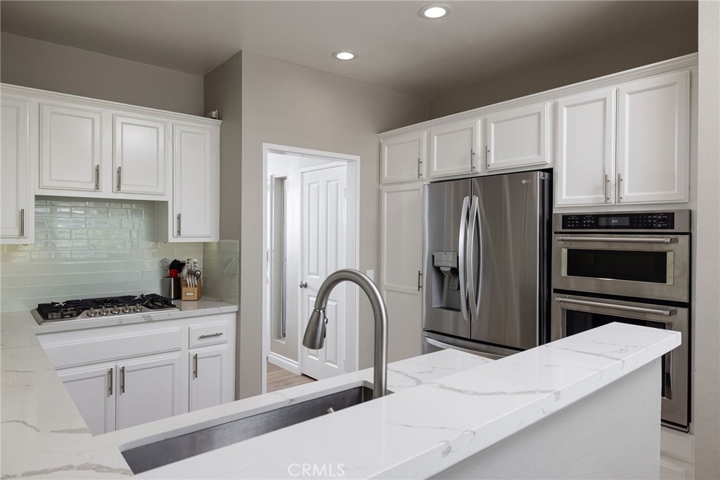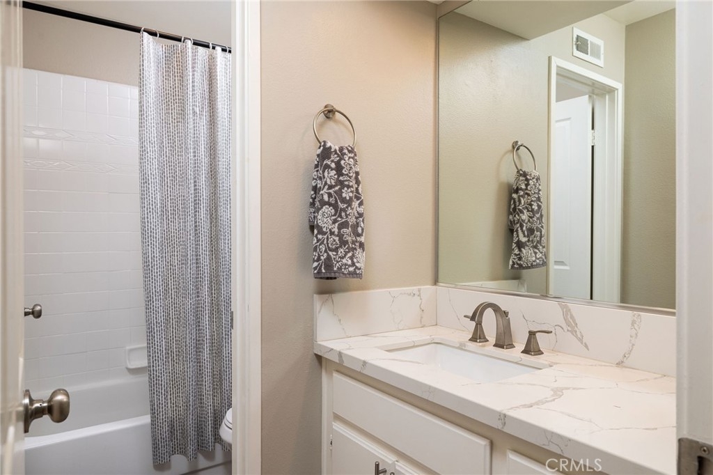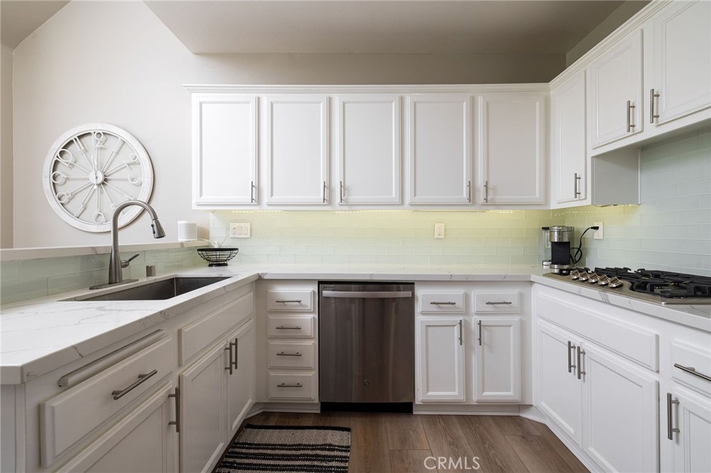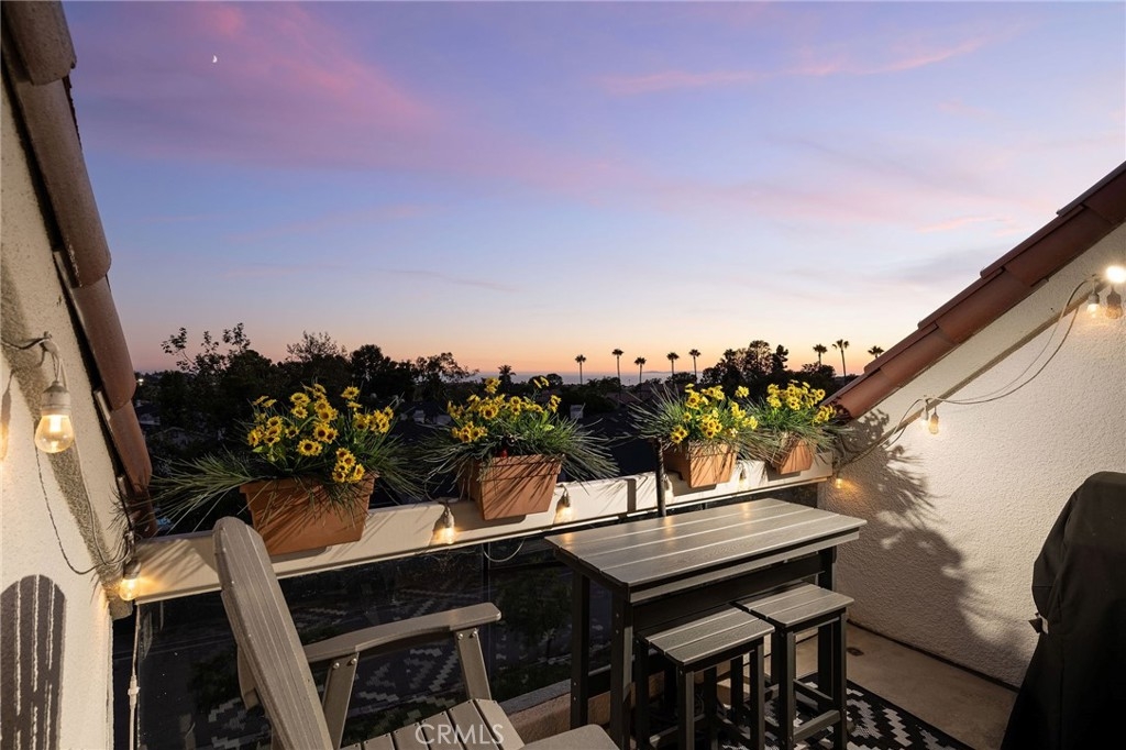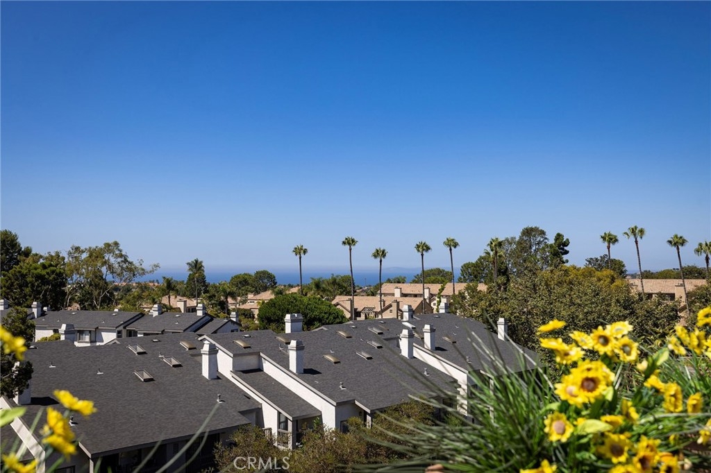 Experience elevated Dana Point coastal living in the exclusive gated community of Encantamar, where ocean views and sunset colors are your daily backdrop. This single-level home features a flowing, open concept with two bedrooms, two full baths, and extensive updates throughout, all oriented to enjoy the coastline and evening skies. Arrive to your private two-car garage with electric vehicle charging outlet and plenty of guest parking nearby. Inside, a formal foyer opens to light-filled living and dining areas with a custom fireplace and sliding doors to a view deck. A bar nook and outdoor living space make entertaining simple, and the southwest exposure frames nightly color over the water. Wide-plank floors guide you through the designer chef's kitchen, featuring quartz countertops, crisp white cabinetry, subway-tile backsplash, and stainless-steel appliances. Vaulted ceilings create an airy atmosphere in the eat-in breakfast nook and convenient quartz built-in desk, while skylights bathe the space in natural light. Both bathrooms have also been remodeled with elegant quartz finishes and upgraded fixtures. The thoughtful floor plan places the two bedrooms on opposite sides for maximum privacy and flexibility. The first spacious bedroom features vaulted ceilings, a large window with plantation shutters, and a generous walk-in closet. The primary suite serves as a private retreat, complete with a sitting area that captures stunning views, plus an upgraded en-suite bath with a double-sink vanity and large walk-in closet. Convenient in-unit laundry is located nearby. Located in the highly desired Encantamar community, you'll enjoy walking distance to shopping, dining, and theaters, with Dana Point Harbor, beaches, and the 5 freeway just minutes away. Community amenities include a year-round heated pool, spa, clubhouse, and fitness center. This is coastal living at its best, offering the complete package of views, location, and community lifestyle.